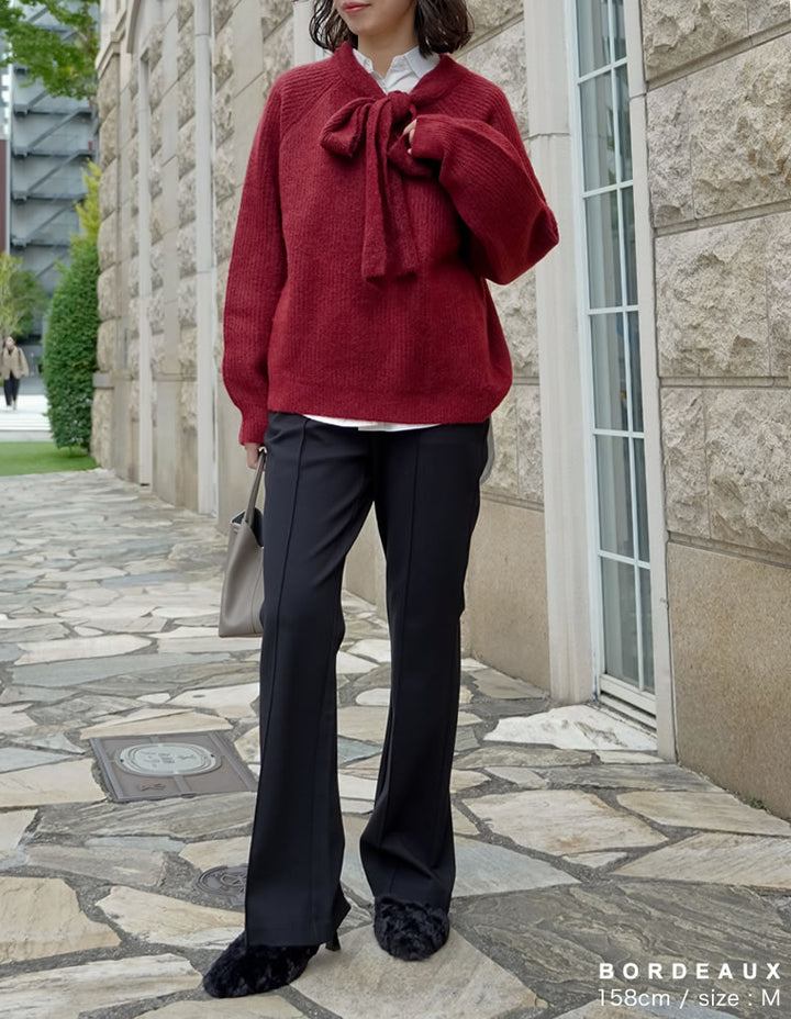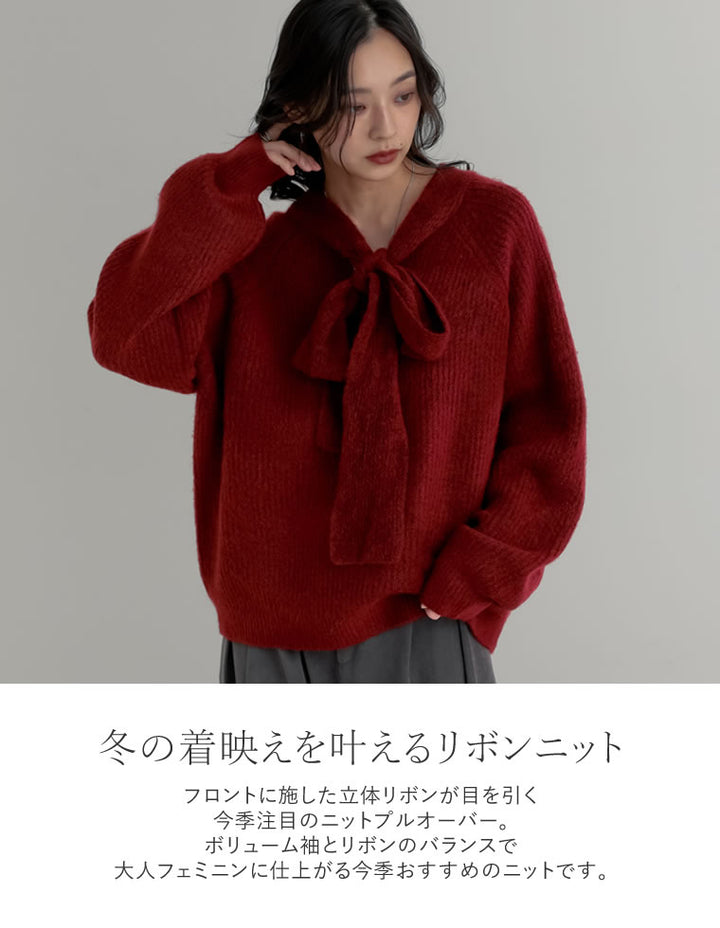 フロントに施した立体リボンが目を引く、今季注目のニットプルオーバー。ふんわりとした優しい着心地の片畦編みで、表情のある一枚に仕上げました。リボンは程よいボリューム感になるよう調整しており、広げて華やかに、半分に折るとすっきりとした印象に。ベーシックカラーはもちろん、差し色として映えるボルドーなど豊富なカラー展開も魅力。ヒップを隠す丈感で自然とスタイルアップが叶い、体型カバーも◎ボリューム袖とリボンのバランスで、大人フェミニンに仕上がる今季おすすめのニットです。