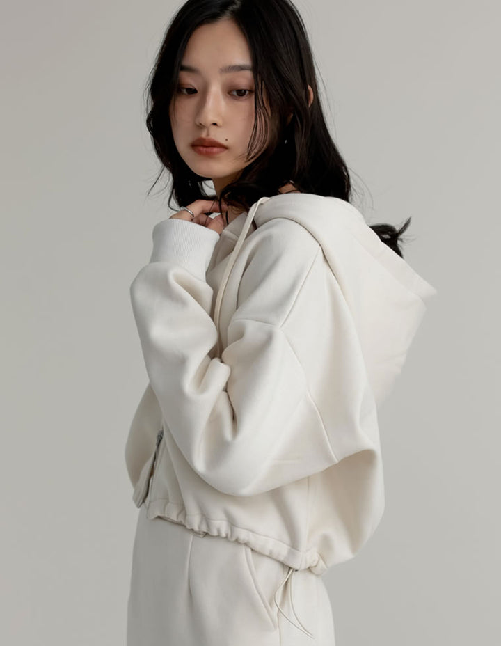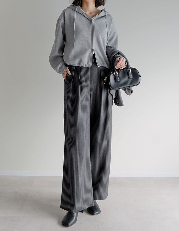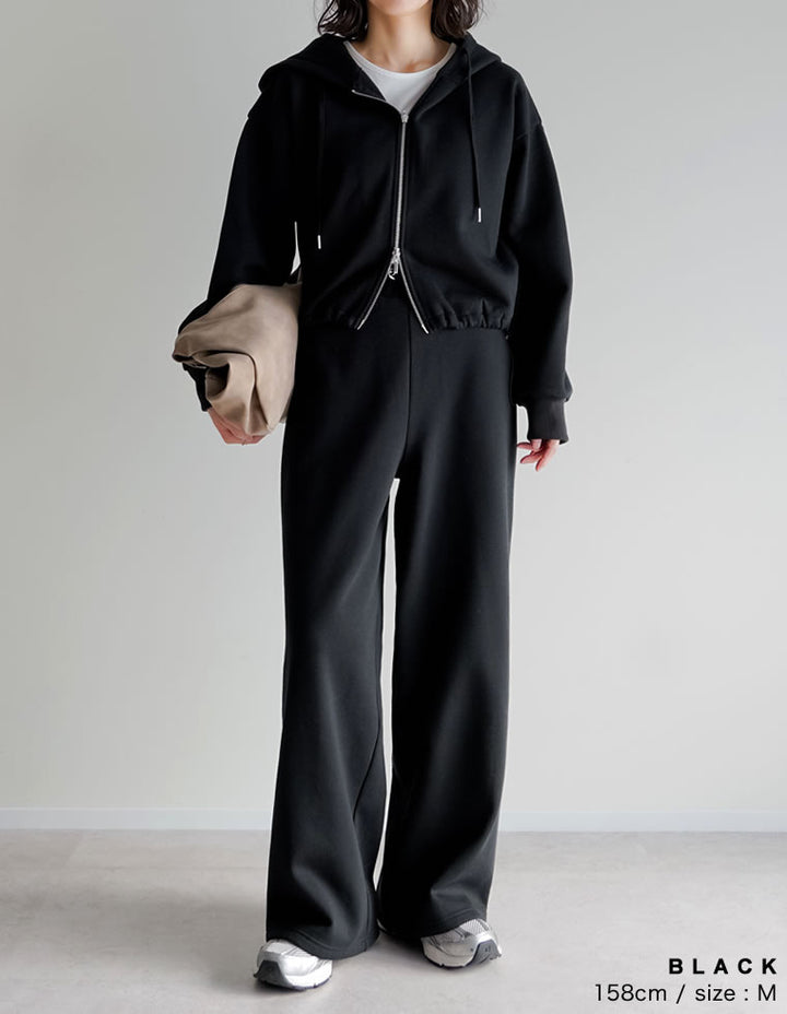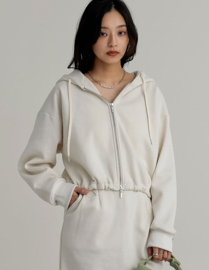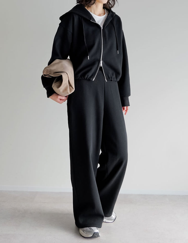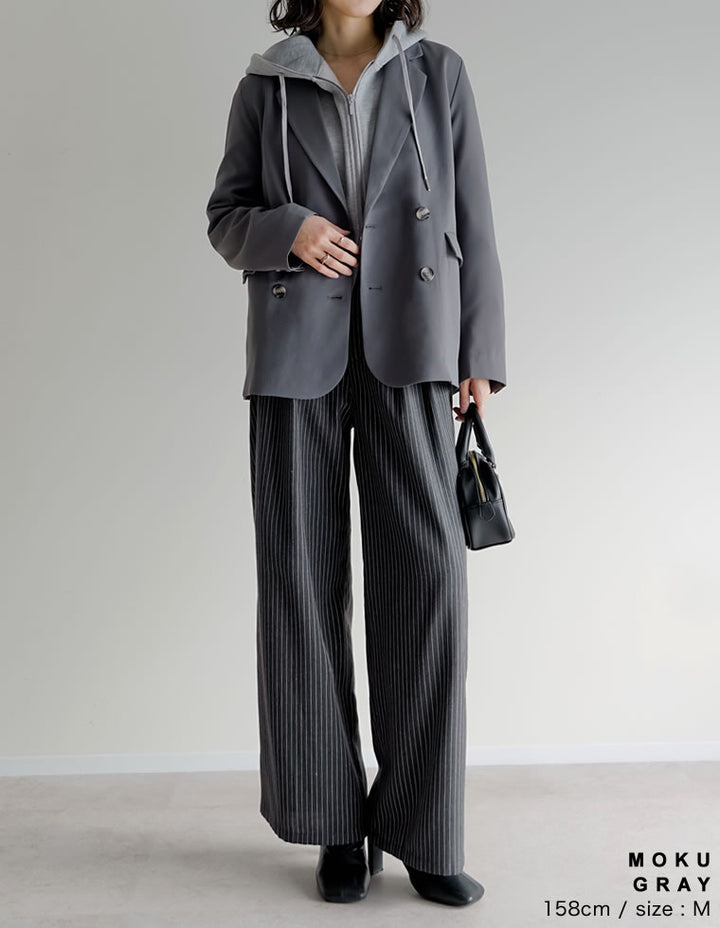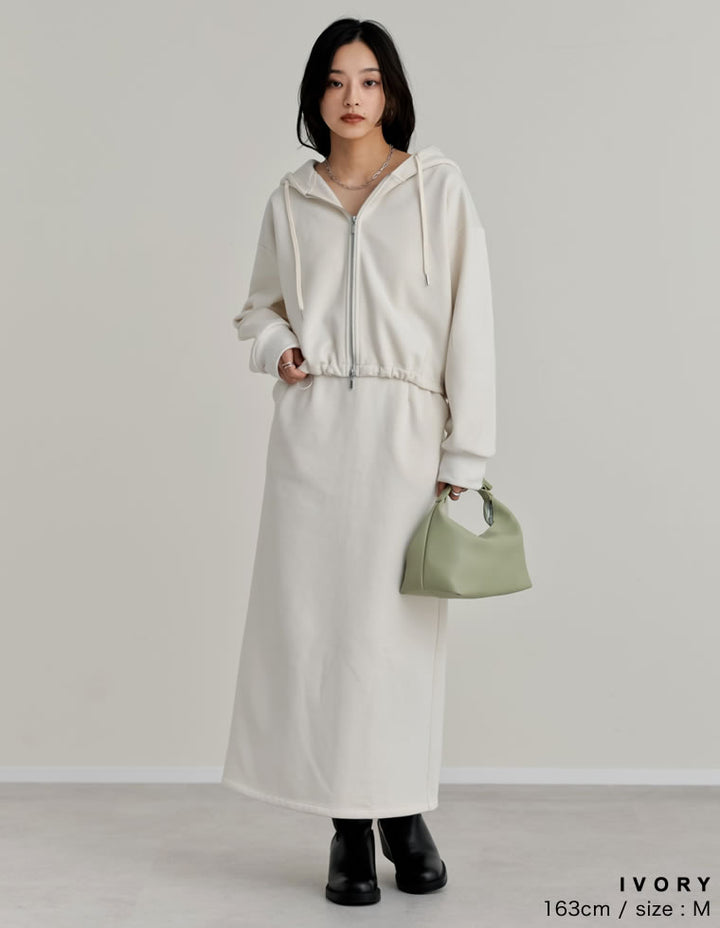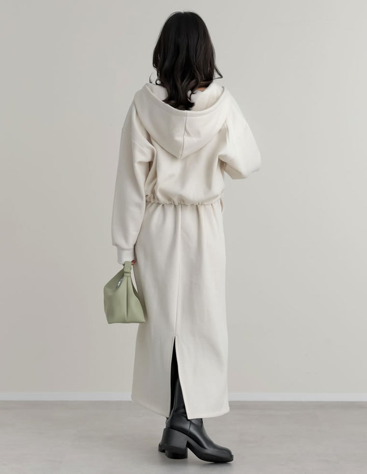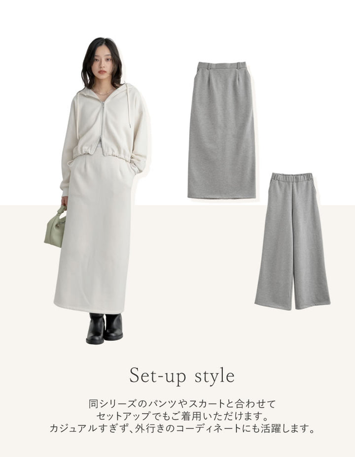 同生地のパンツとのセットアップがおすすめ。テーラードジャケットなどのアウターを羽織り、フードを出したレイヤードスタイルもおすすめです。秋冬はもちろん、春先はライトアウターとしてロングシーズン楽しめます。