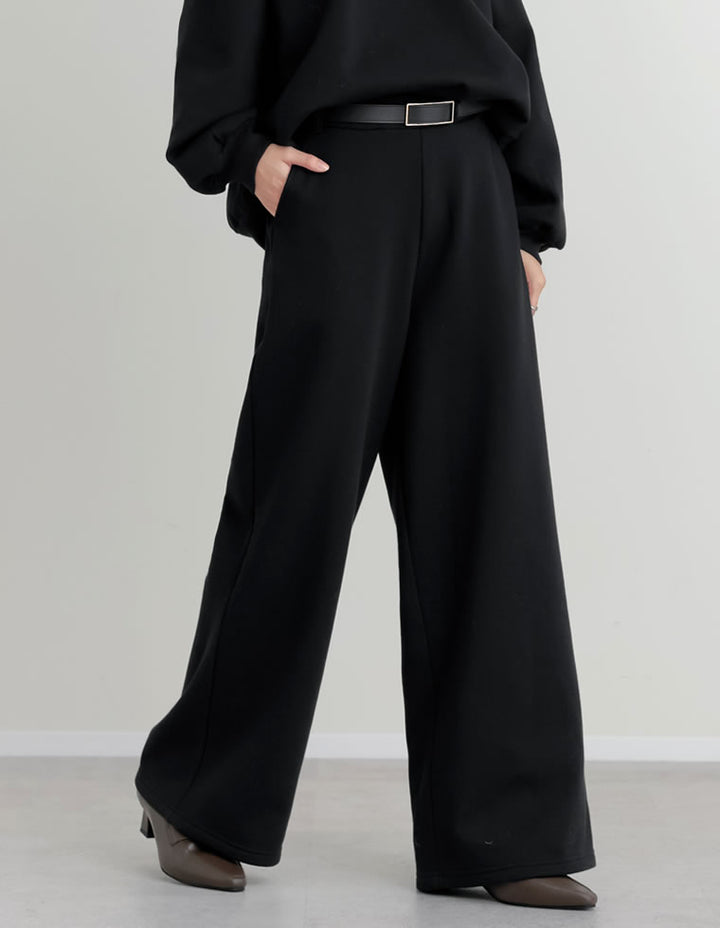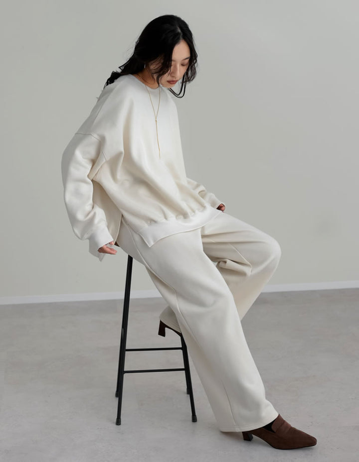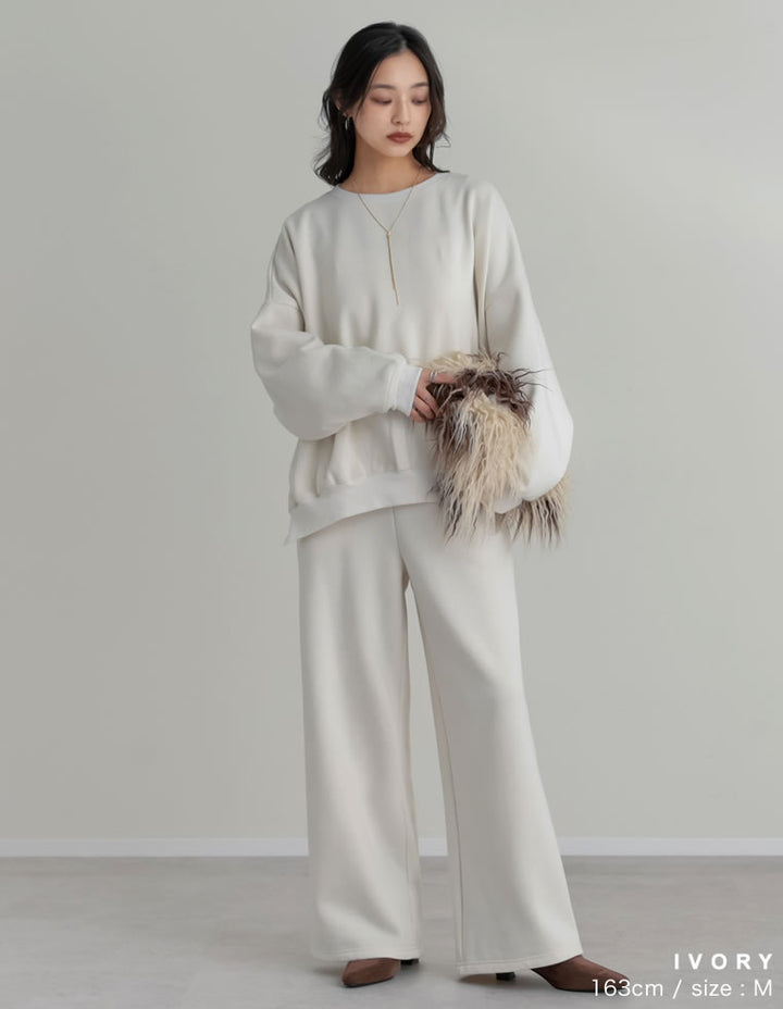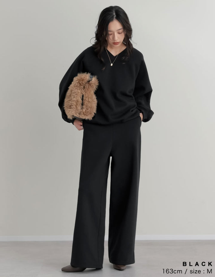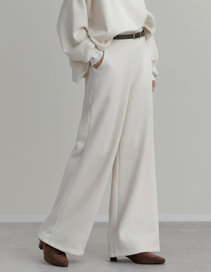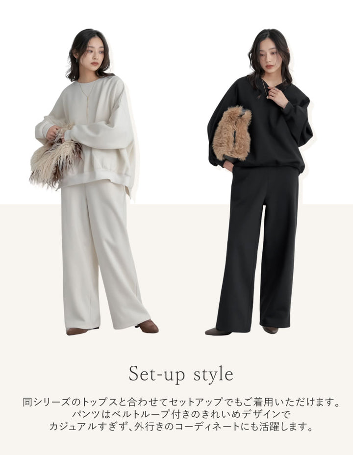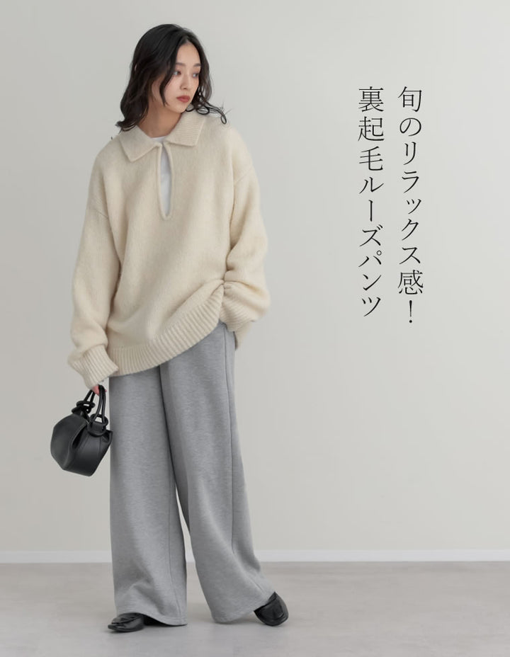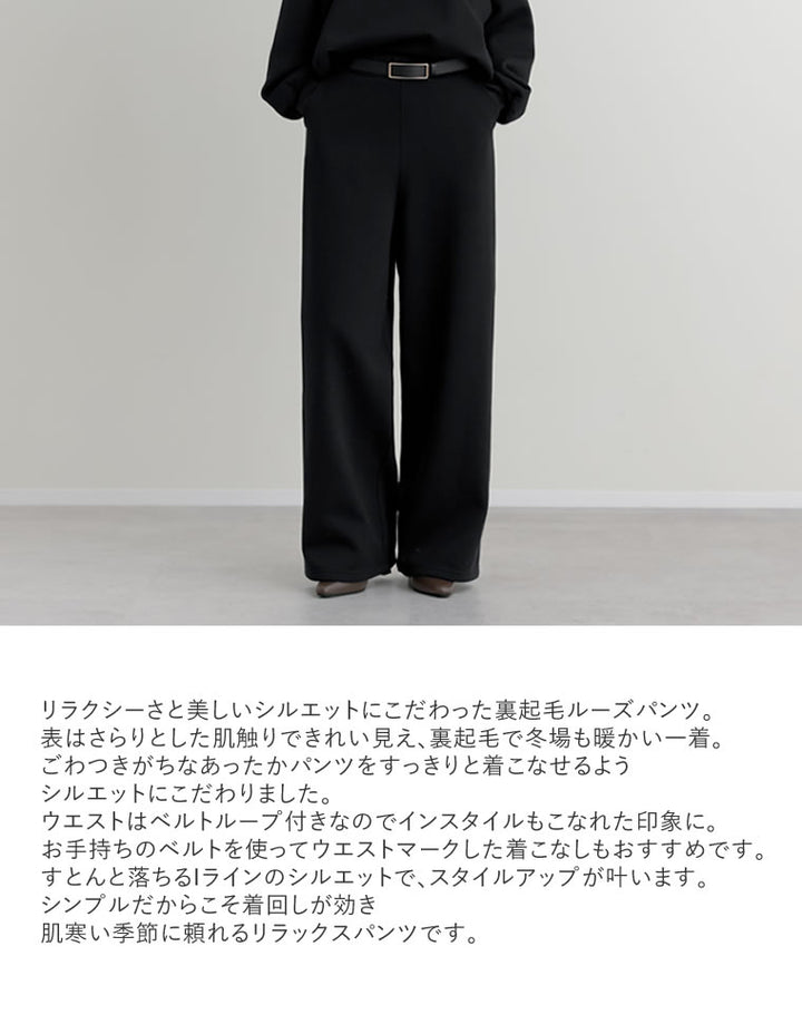 リラクシーさと美しいシルエットにこだわった裏起毛ルーズパンツ。表はさらりとした肌触りできれい見えし、裏起毛で冬場も暖かい一着です。ごわつきがちなあったかパンツを、すっきりと着こなせるようシルエットにこだわりました。ウエストはベルトループ付きなので、インスタイルもこなれた印象に。お手持ちのベルトでウエストマークする着こなしもおすすめです。すとんと落ちるIラインシルエットで、スタイルアップが叶います。シンプルだからこそ着回しが効き、肌寒い季節に頼れるリラックスパンツです。