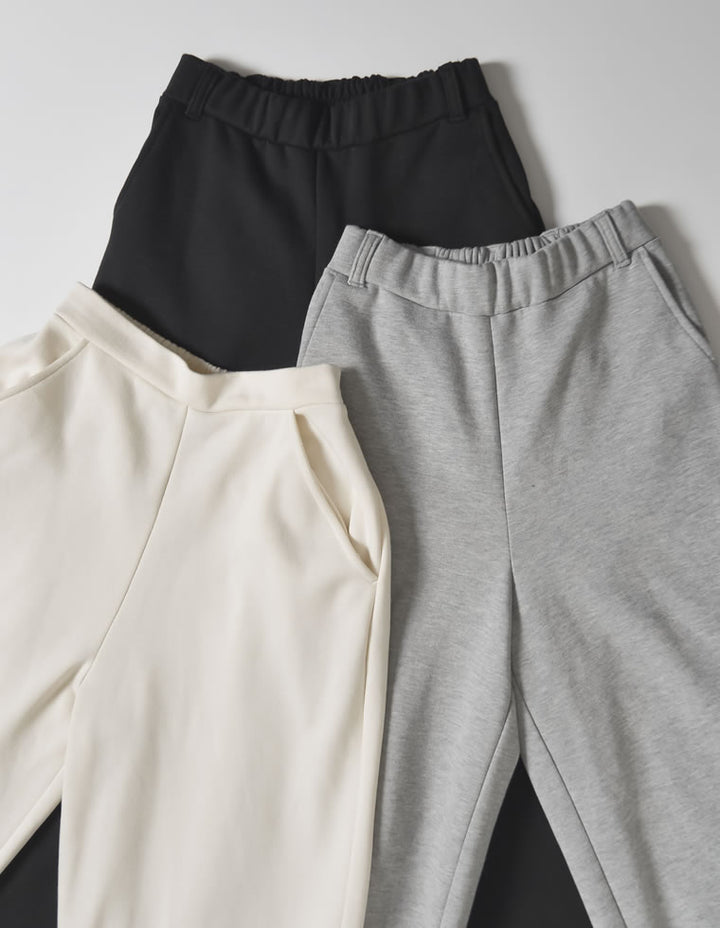同生地のスウェットトップスやパーカー合わせはもちろん、ニットプルオーバーなどとも好相性。カジュアルな素材感ですが、ジャケットを羽織るときれいめな印象に仕上がります。ベルトを合わせてウエストマークすると、モードな雰囲気で着こなせます。