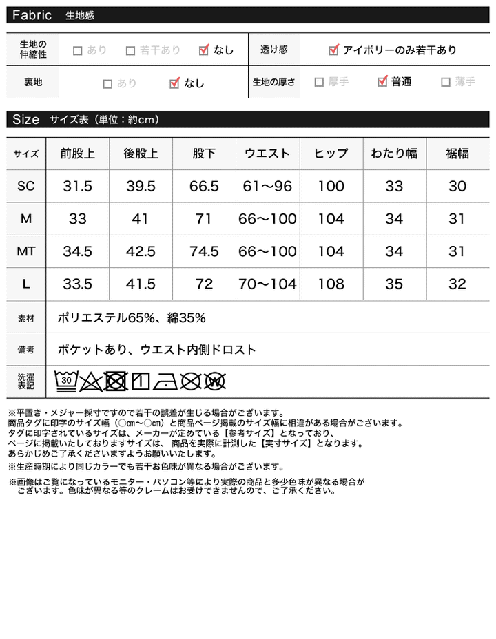 | サイズ | 前股上 | 後股上 | 股下 | ウエスト | ヒップ | わたり幅 | 裾幅 |