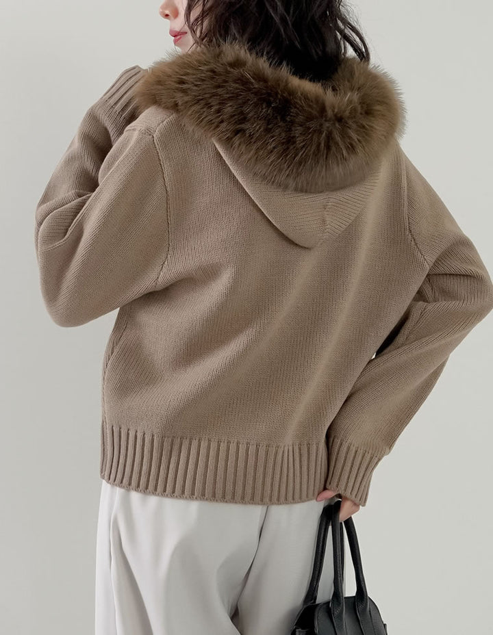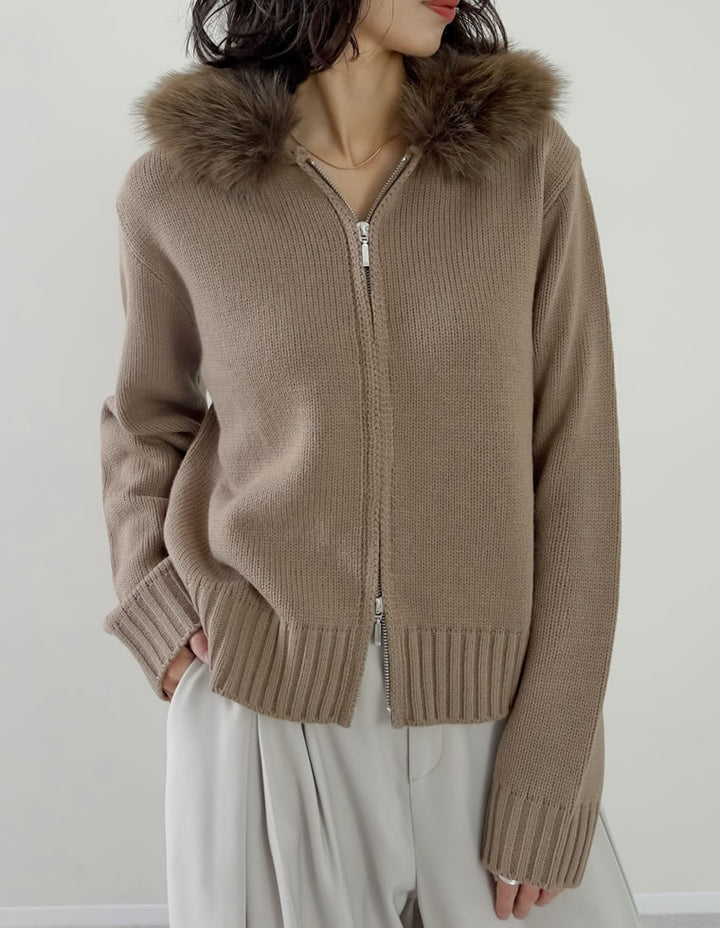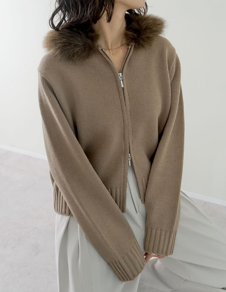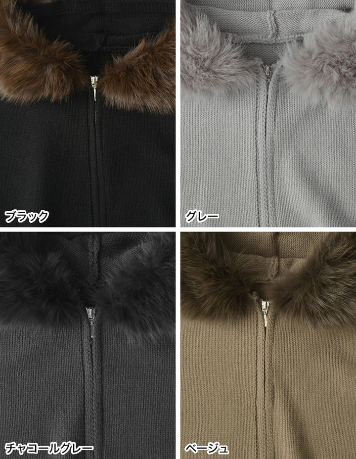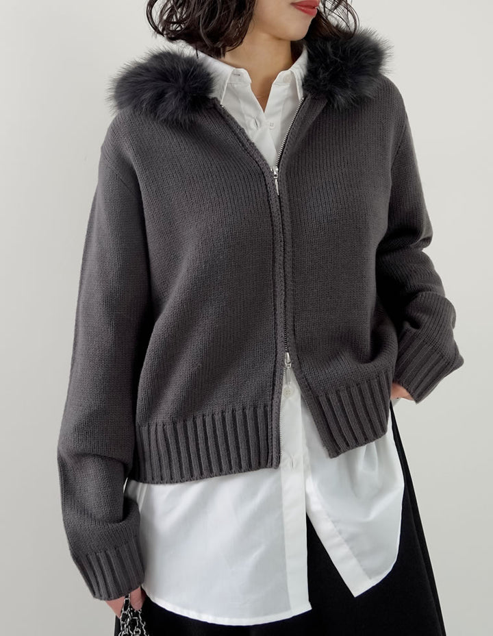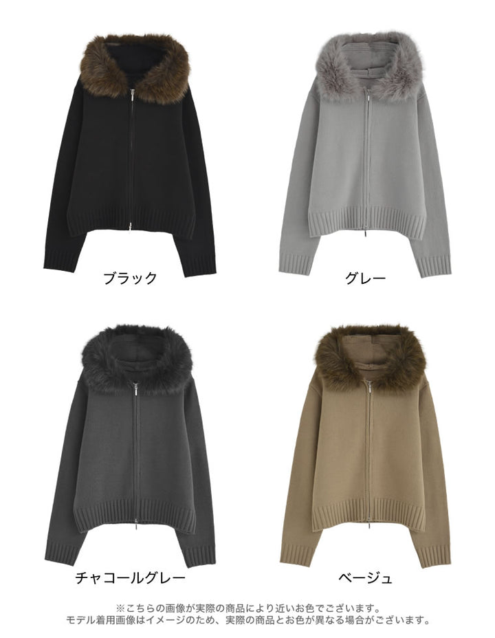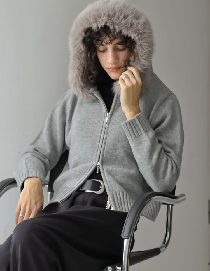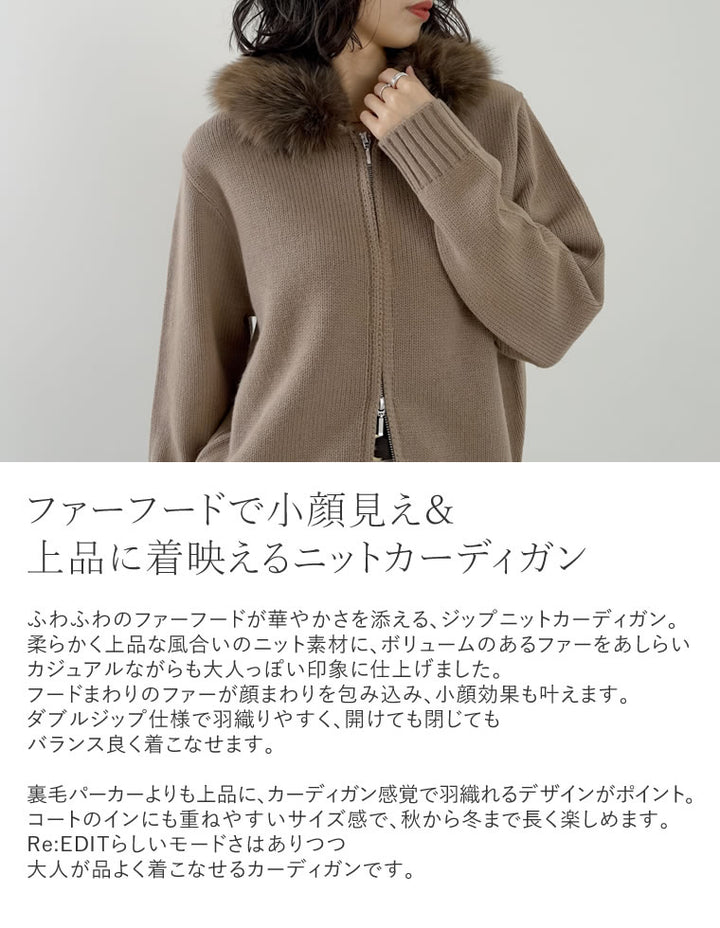 ふわふわのファーフードが華やかさを添える、ジップニットカーディガン。
