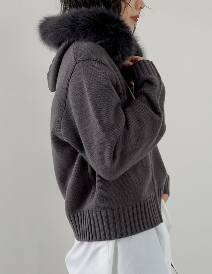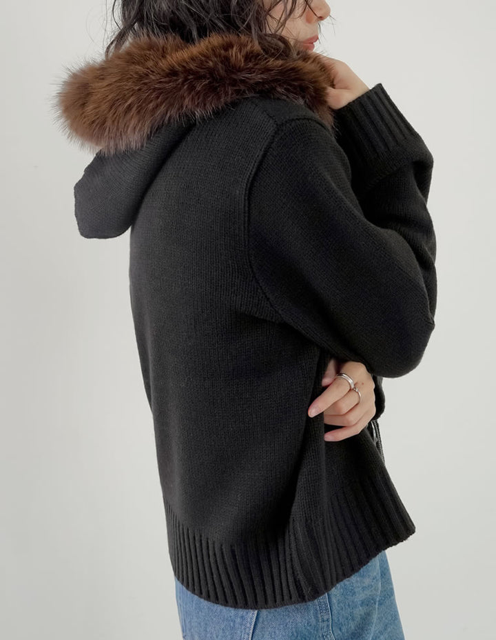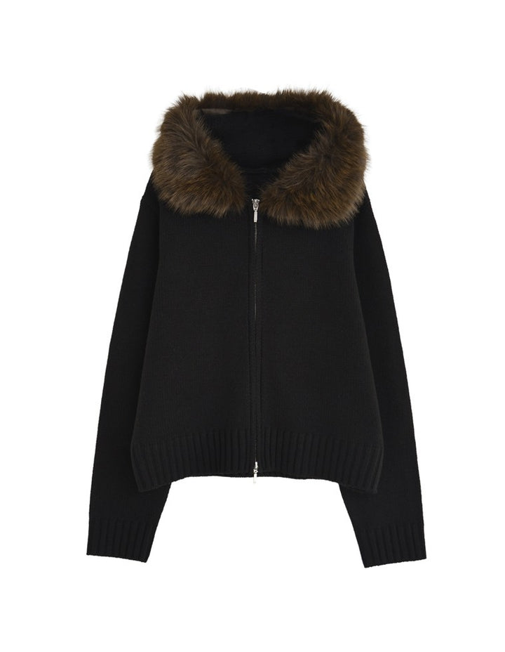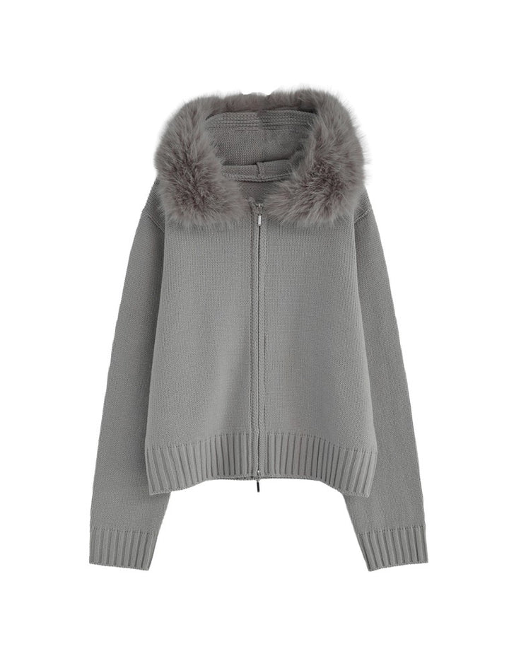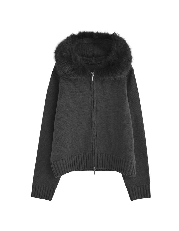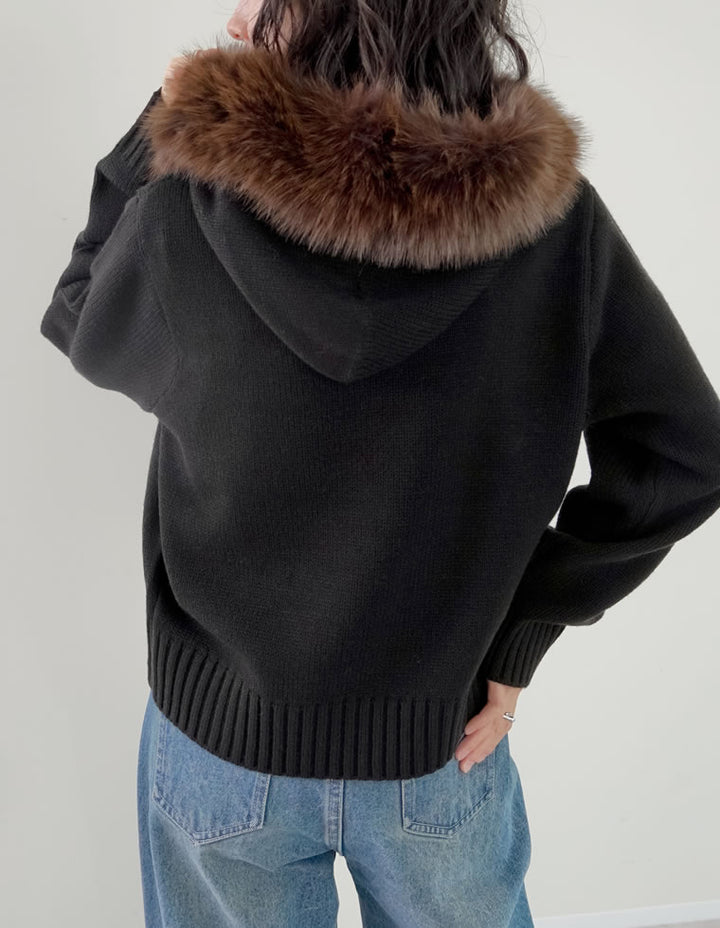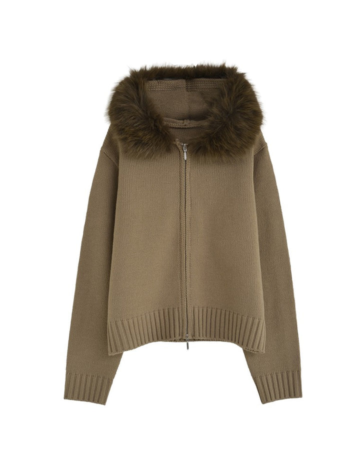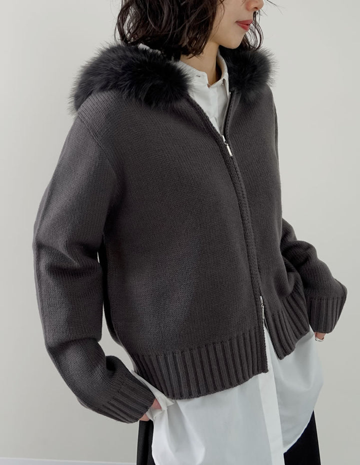 ふわふわのファーフードが華やかさを添える、ジップニットカーディガン。