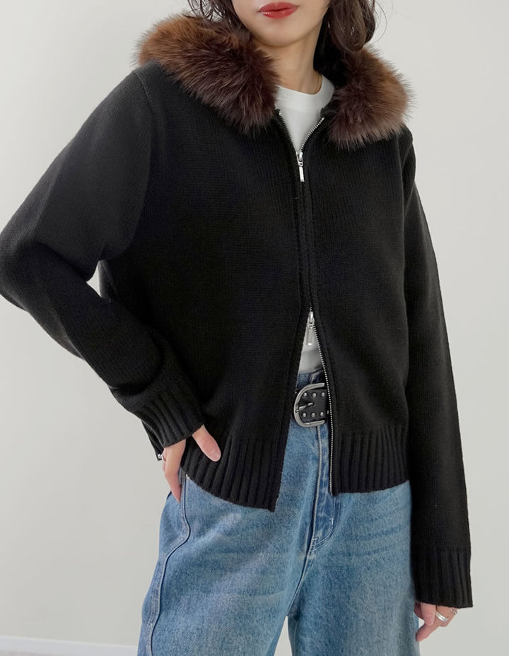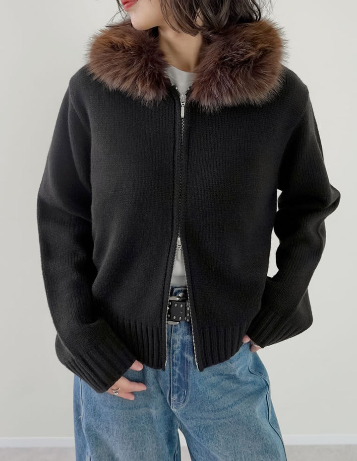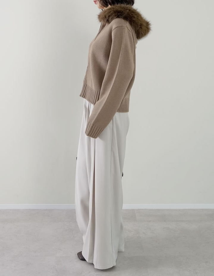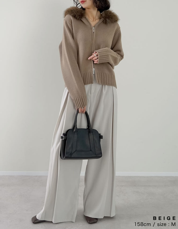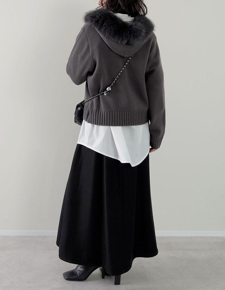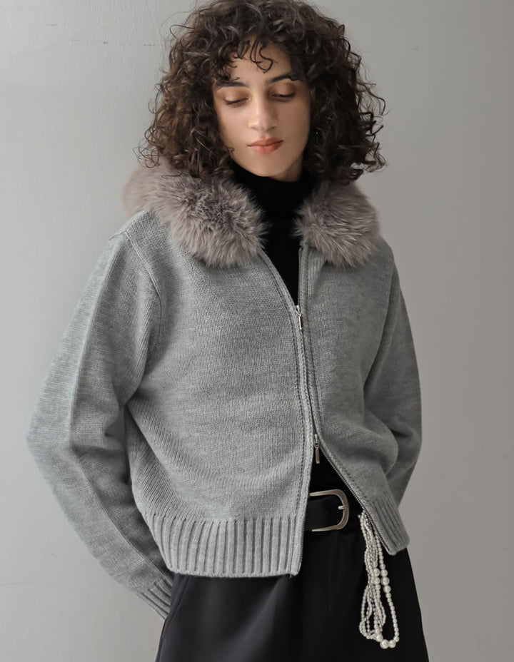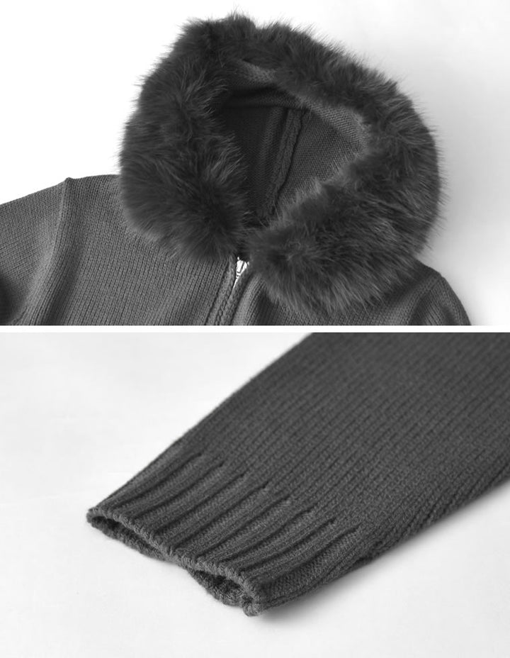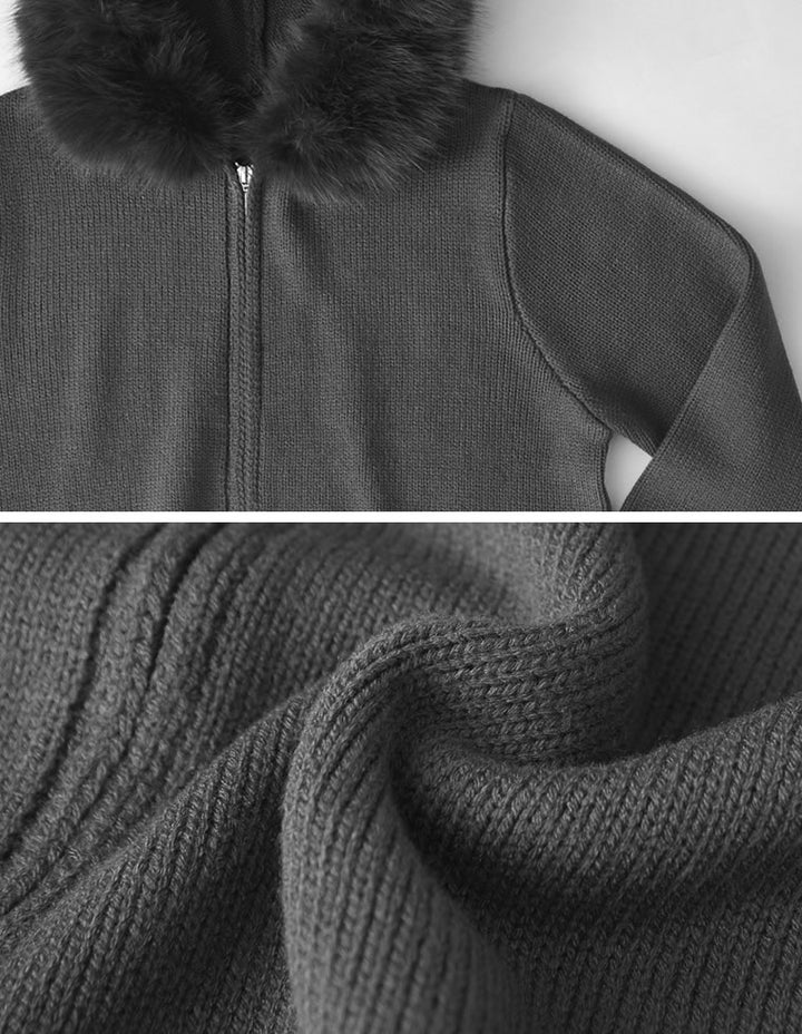 ふわふわのファーフードが華やかさを添える、ジップニットカーディガン。