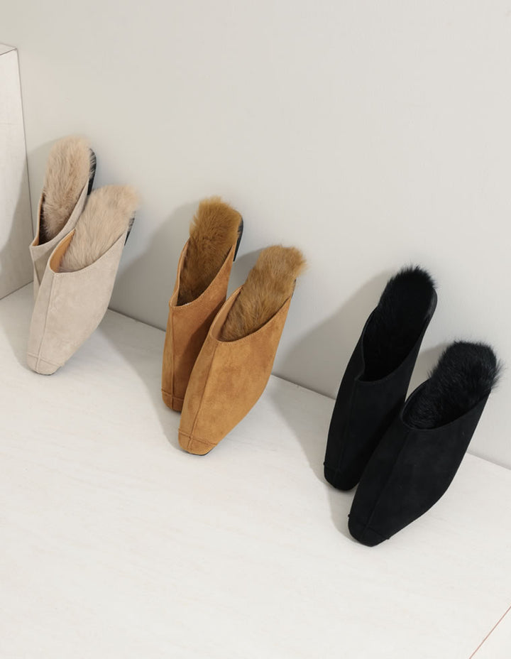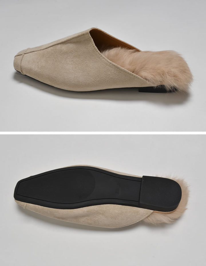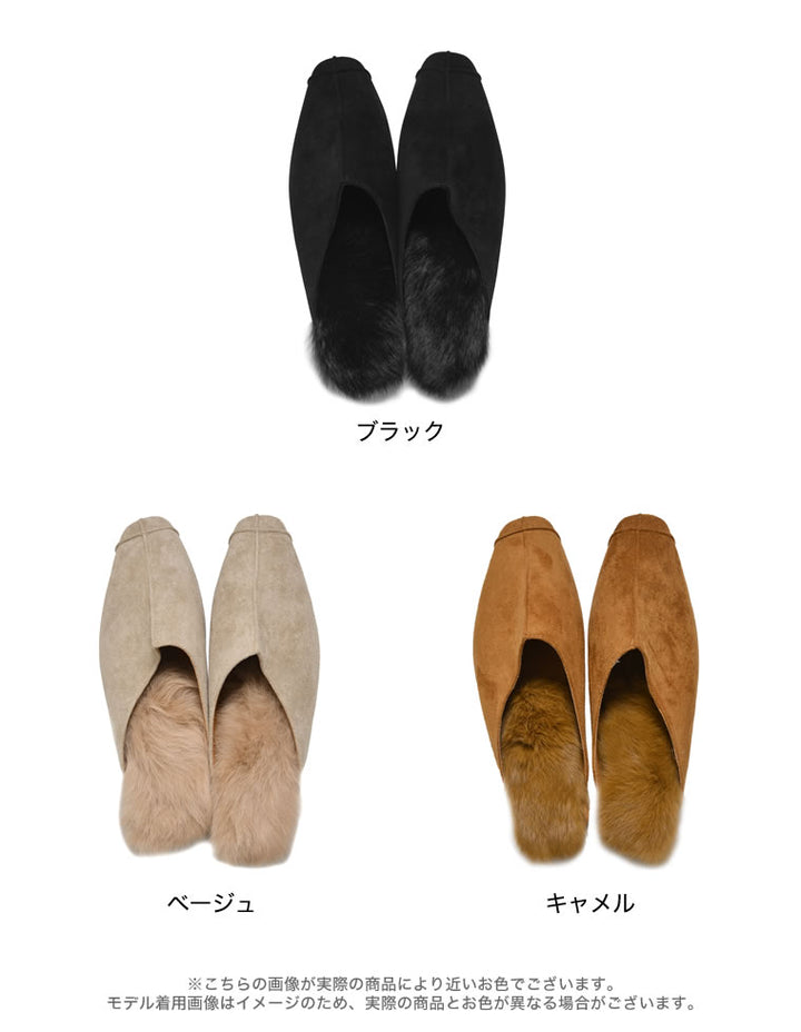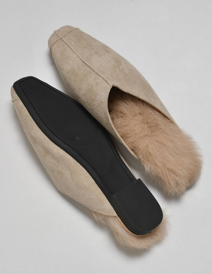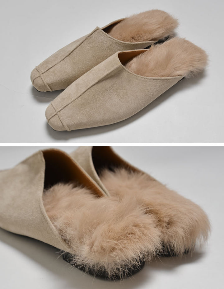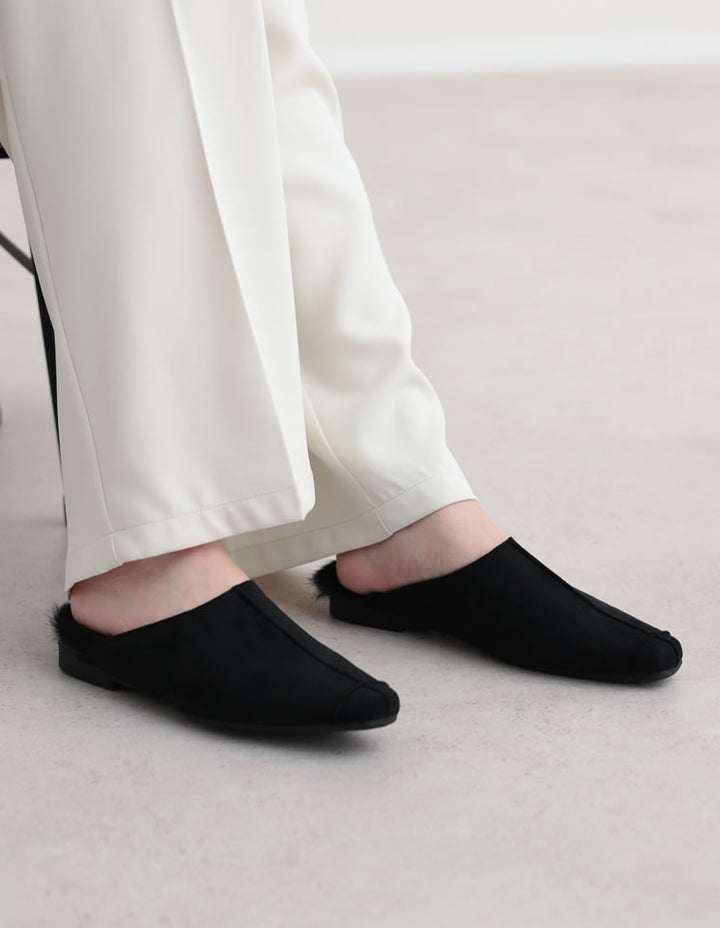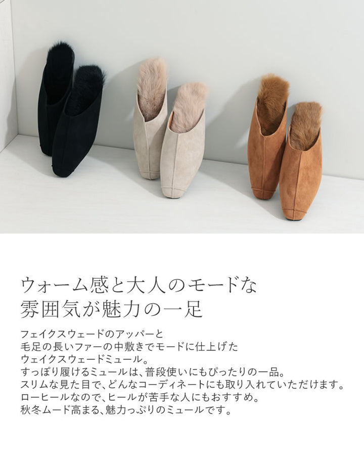 フェイクスウェードのアッパーと、毛足の長いファーの中敷きでモードに仕上げたウェイクスウェードミュール。
