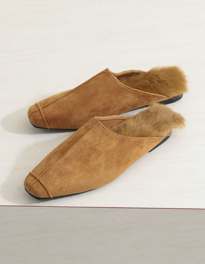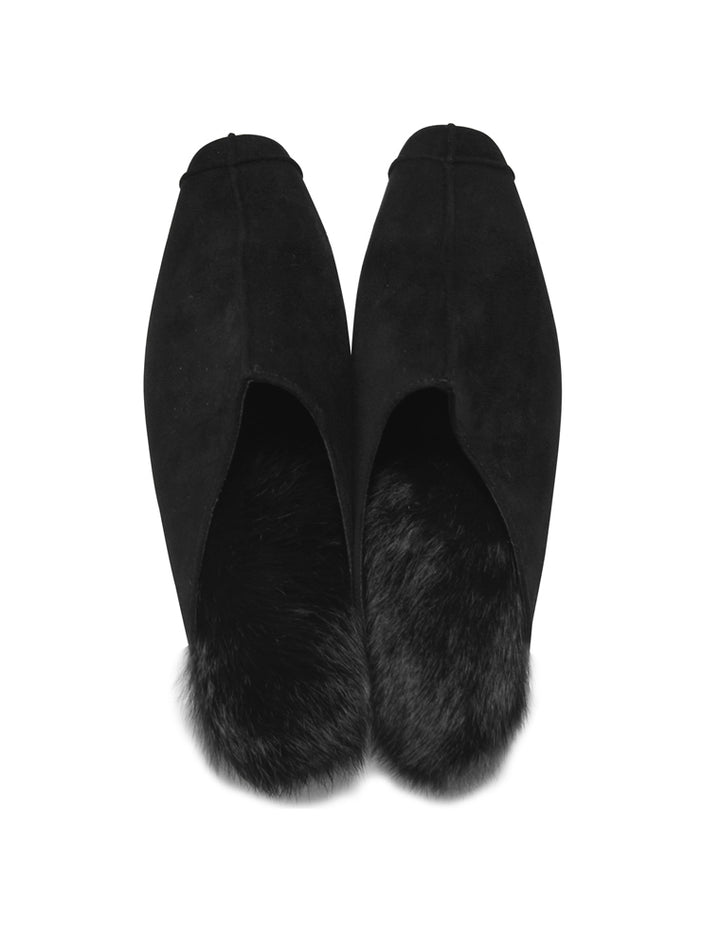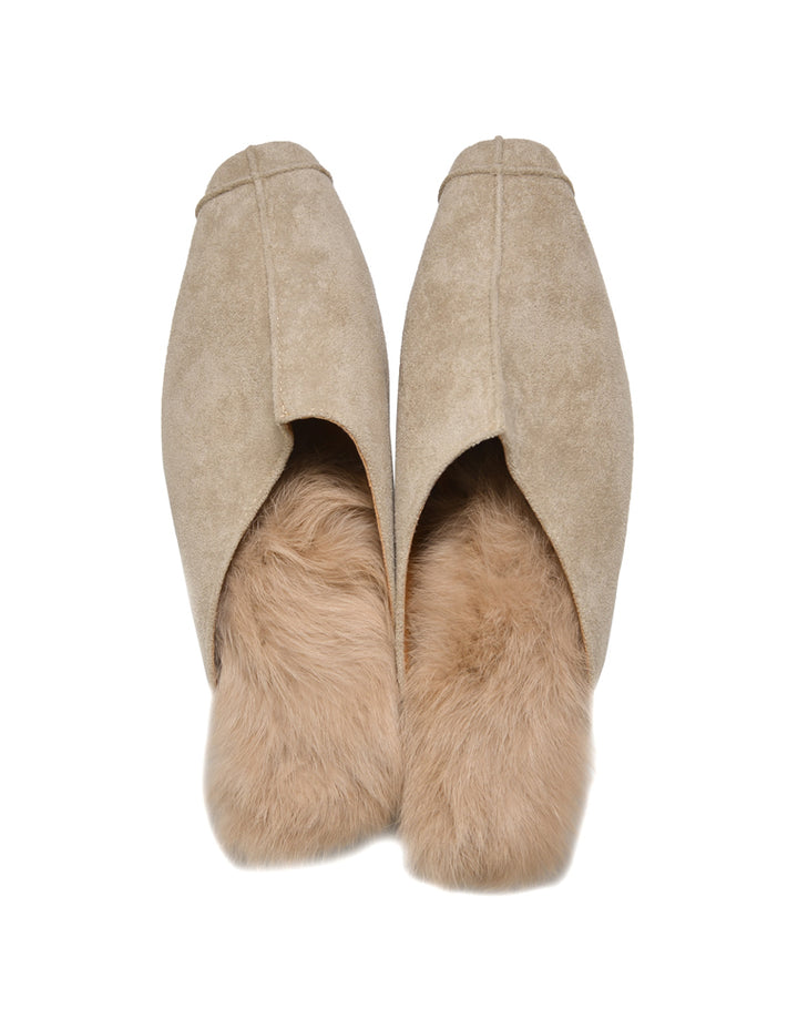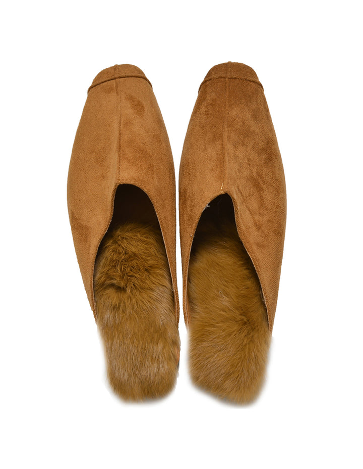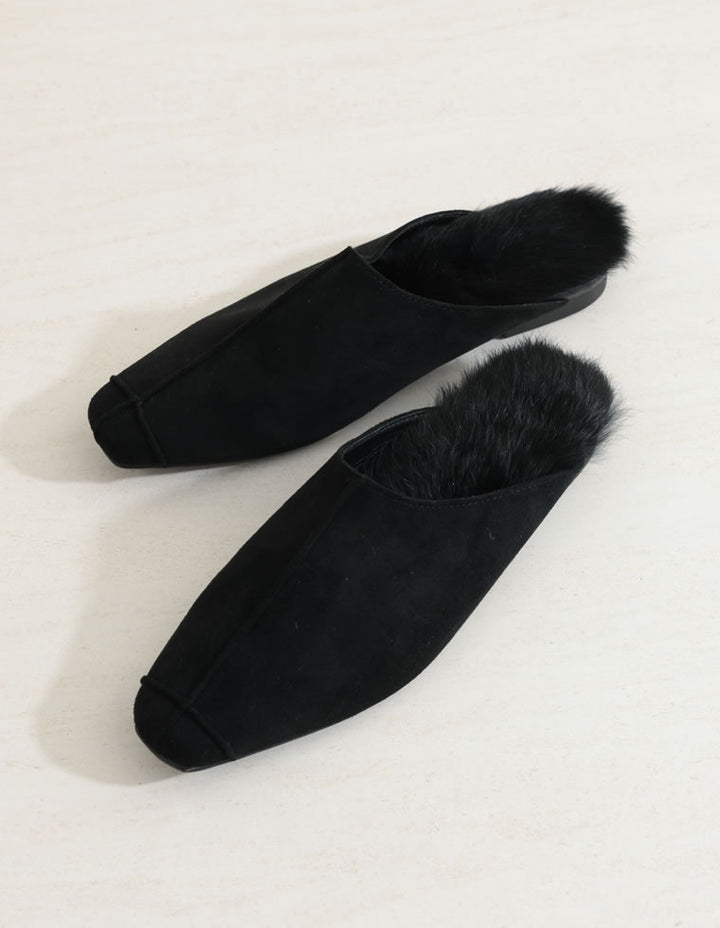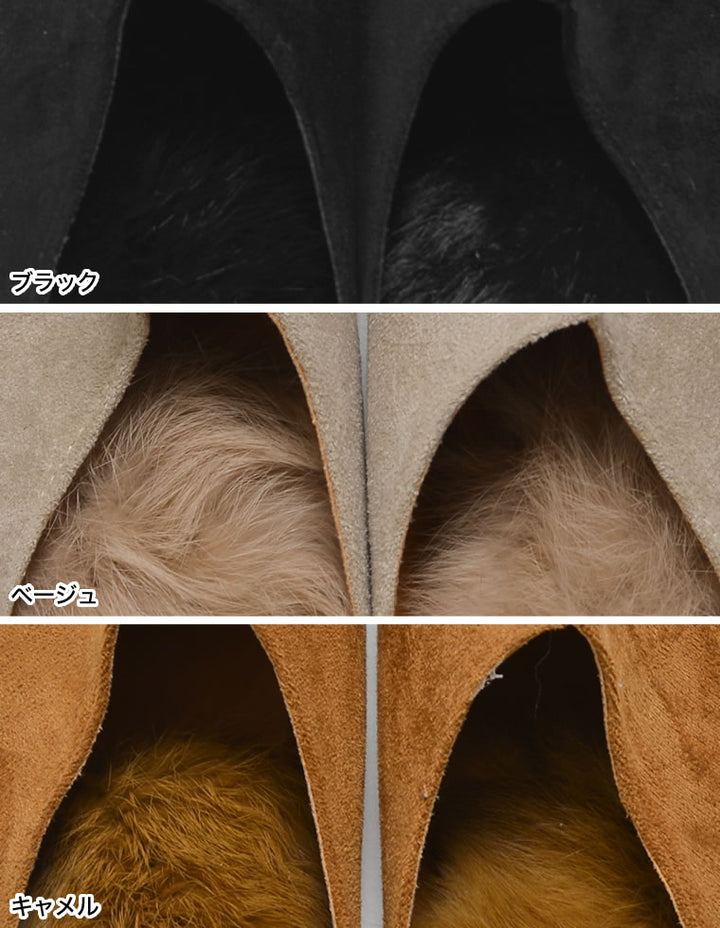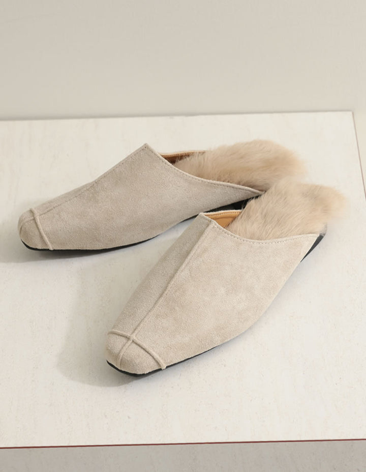フェイクスウェードのアッパーと、毛足の長いファーの中敷きでモードに仕上げたウェイクスウェードミュール。