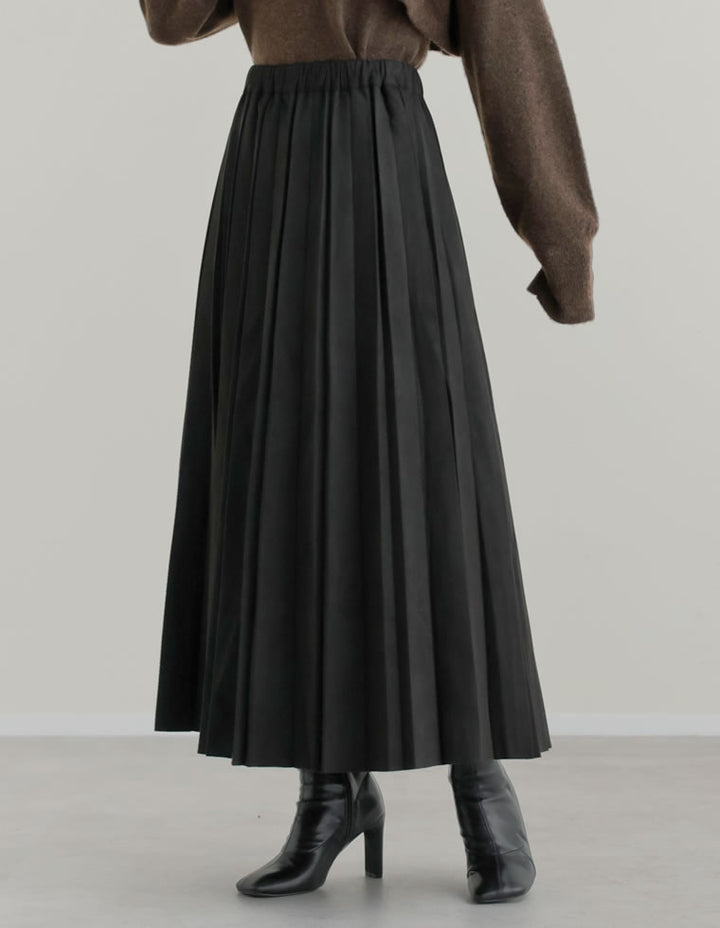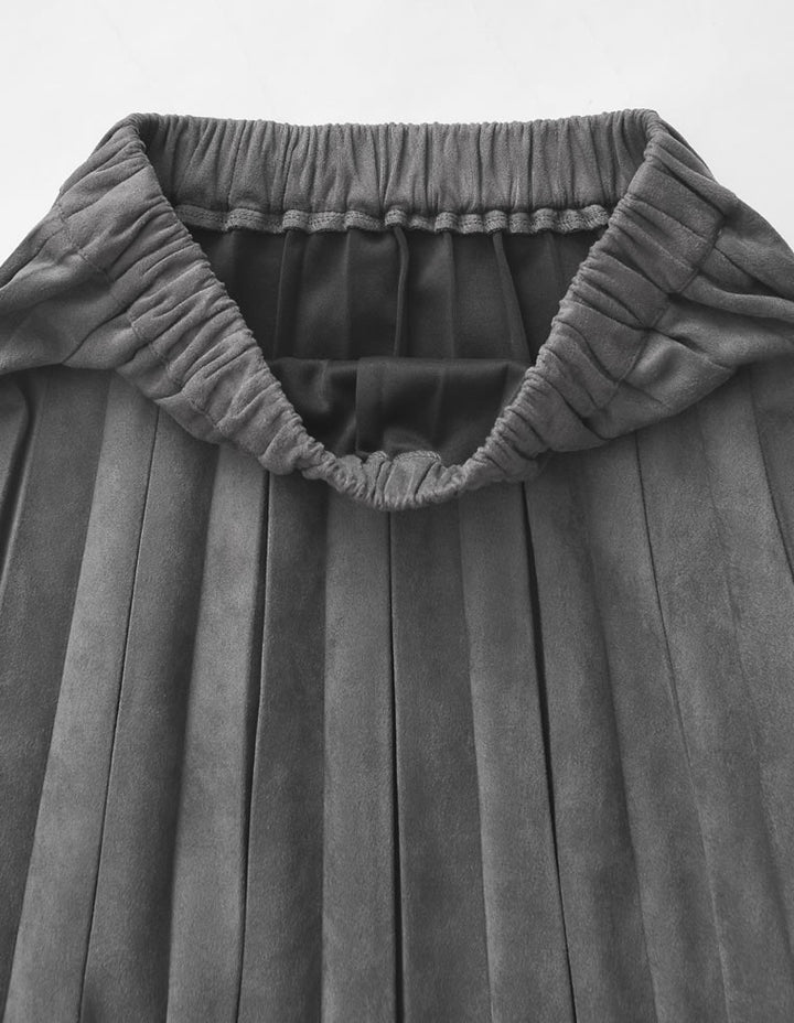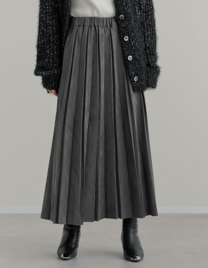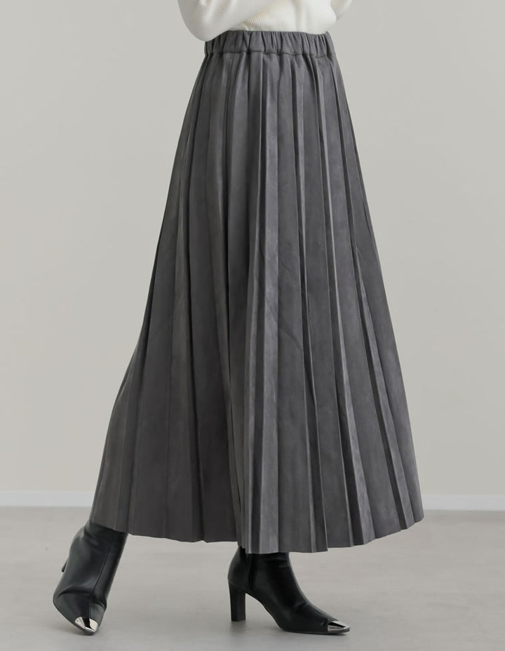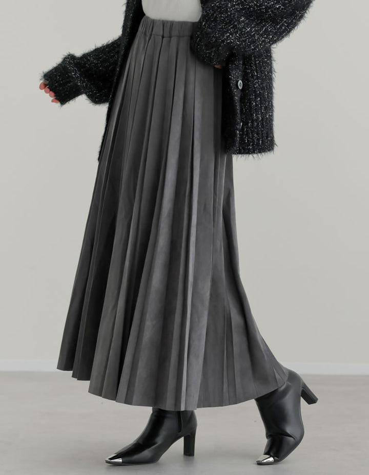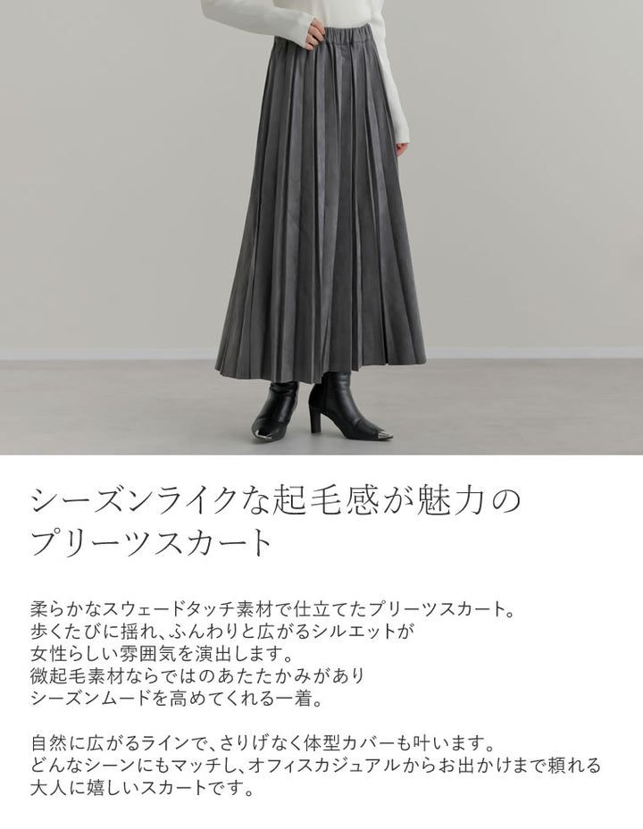 柔らかなスウェードタッチ素材で仕立てたプリーツスカート。歩くたびに揺れ、ふんわりと広がるシルエットが女性らしい雰囲気を演出します。微起毛素材ならではのあたたかみがあり、シーズンムードを高めてくれる一着。自然に広がるラインで、さりげなく体型カバーも叶います。どんなシーンにもマッチし、オフィスカジュアルからお出かけまで頼れる、大人に嬉しいスカートです。