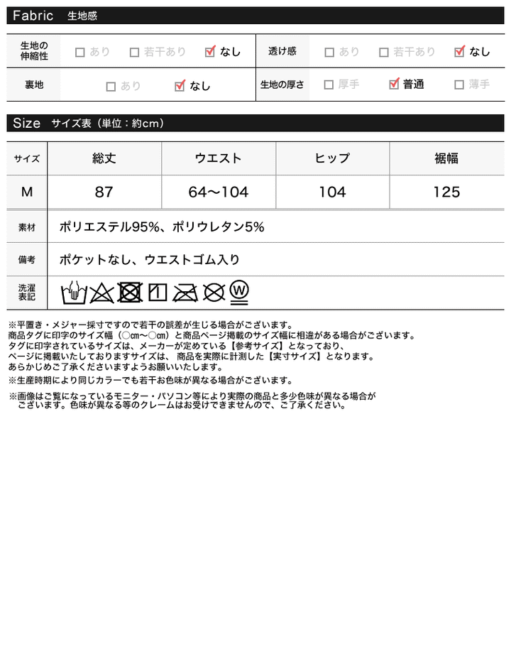 | サイズ | 総丈 | ウエスト | ヒップ | 裾幅 |
