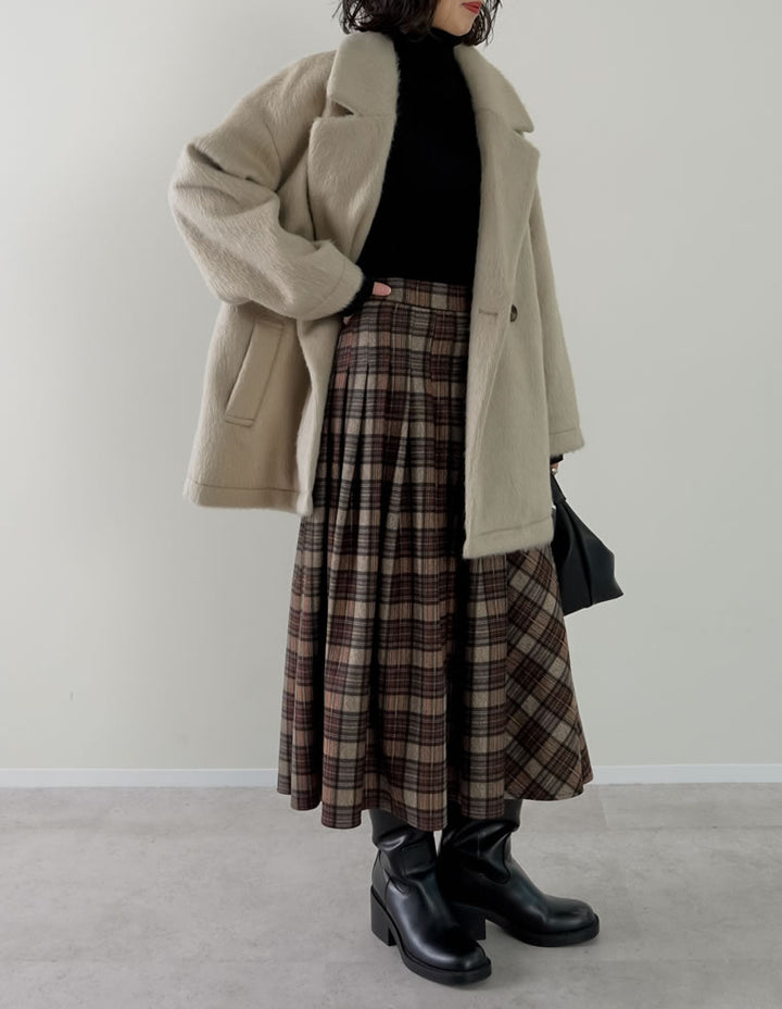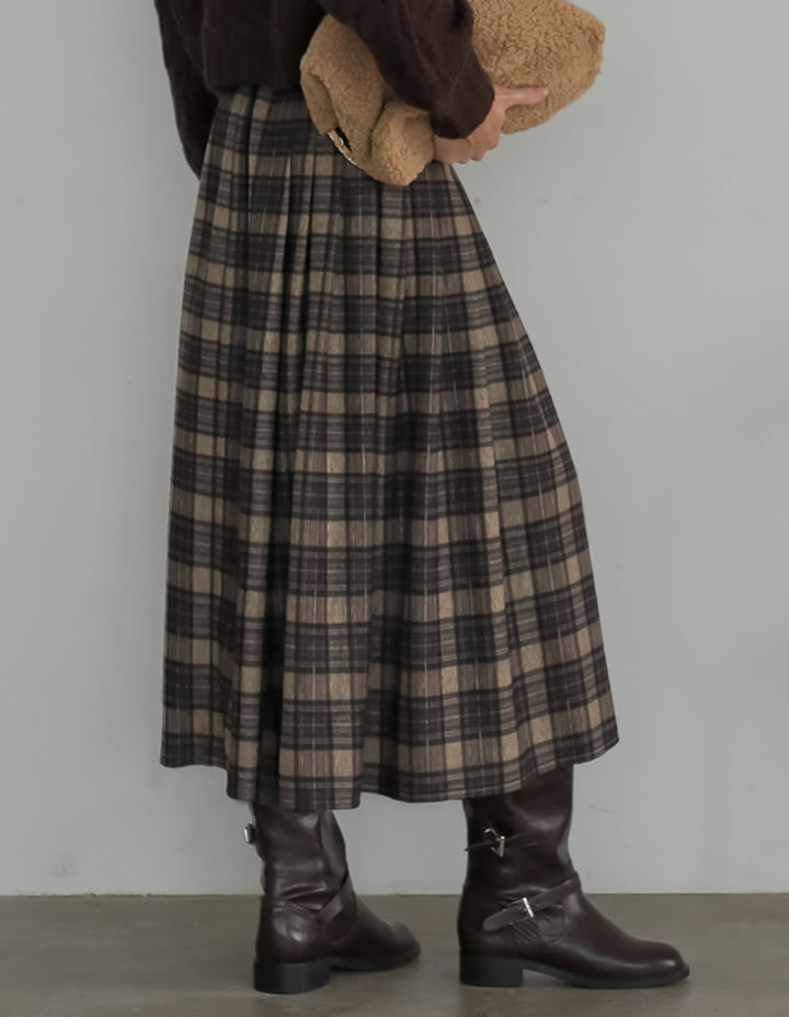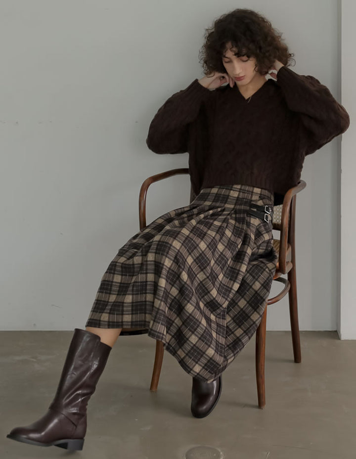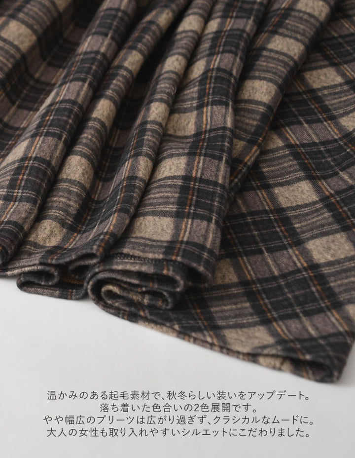 シーズンムードを高めるチェック柄のプリーツスカートが登場。動くたびに揺れるプリーツがアクセントとなり、クラシカルな雰囲気を演出します。やや幅広のプリーツが表情に奥行きを生み、立体的で存在感のある仕上がりに。ウエストにはダブルベルトをあしらい、トレンド感とスタイルアップ効果を両立しました。起毛感のある素材があたたかみを添え、秋冬らしい装いをアップデート。落ち着きのあるカラーと程よい丈感で、カジュアルになりすぎず日常使いしやすい1枚です。