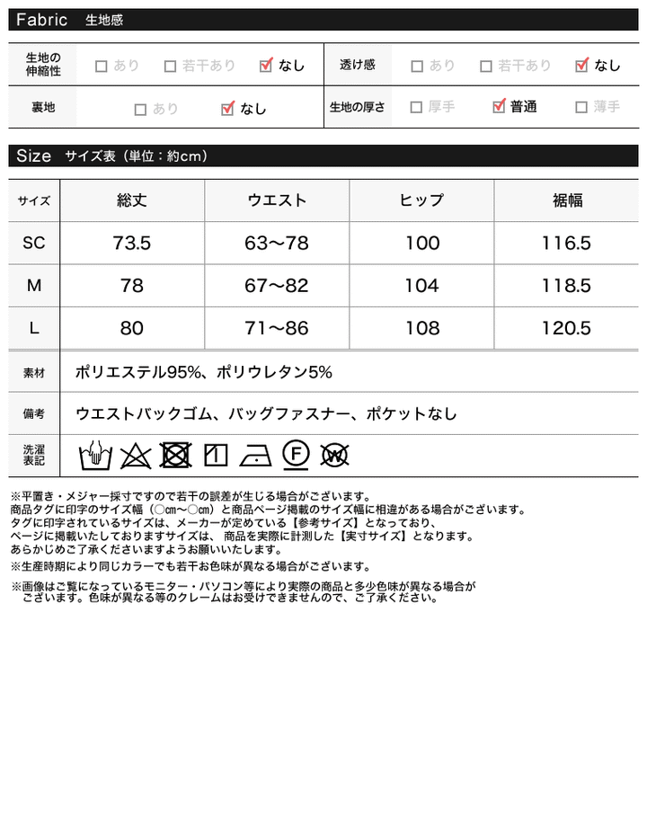 | サイズ | 総丈 | ウエスト | ヒップ | 裾幅 |