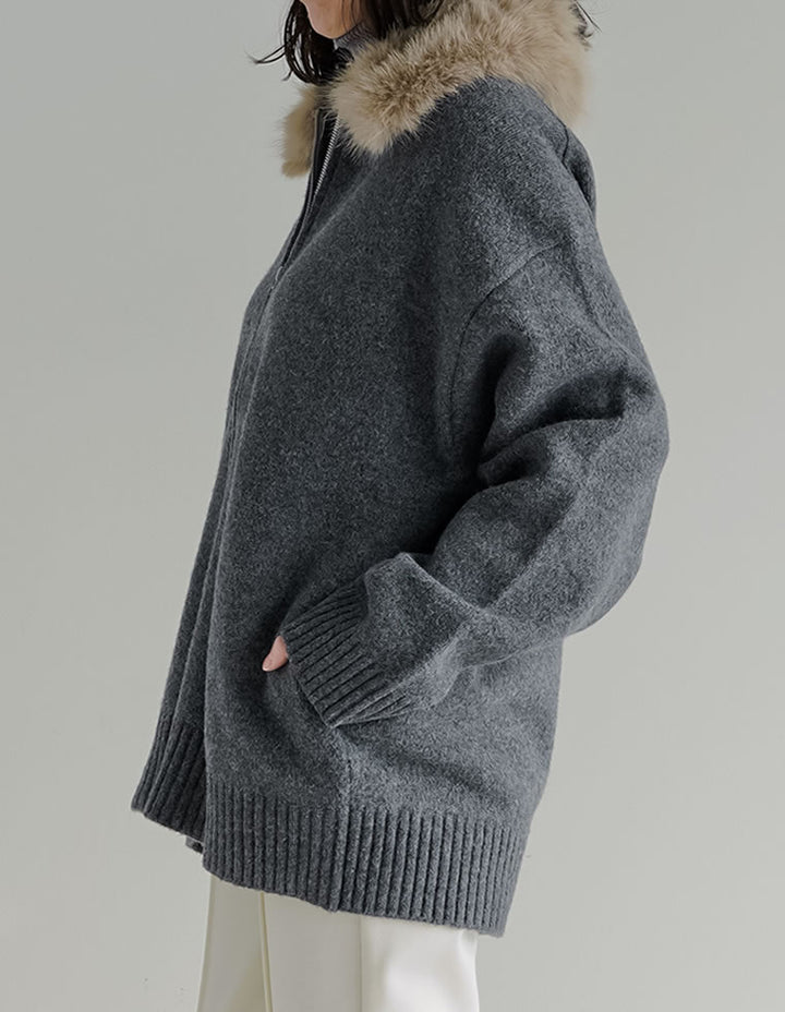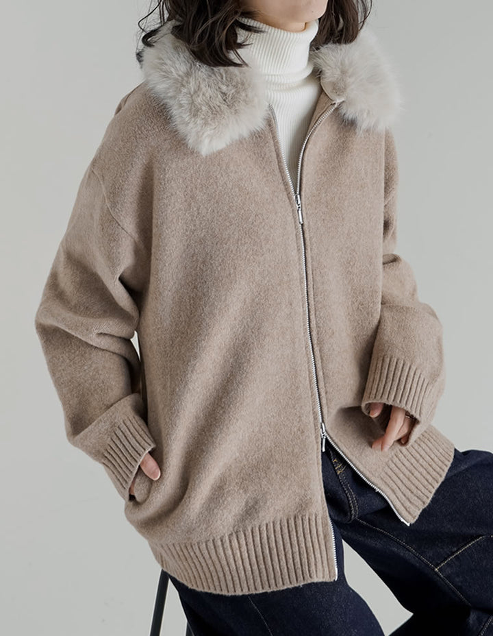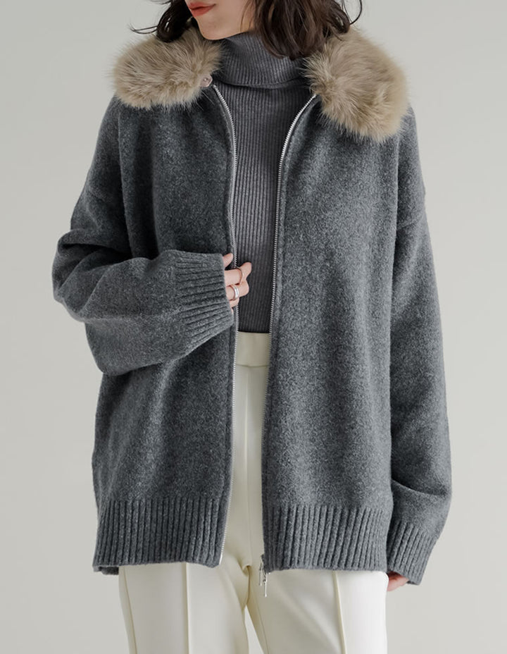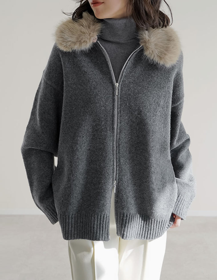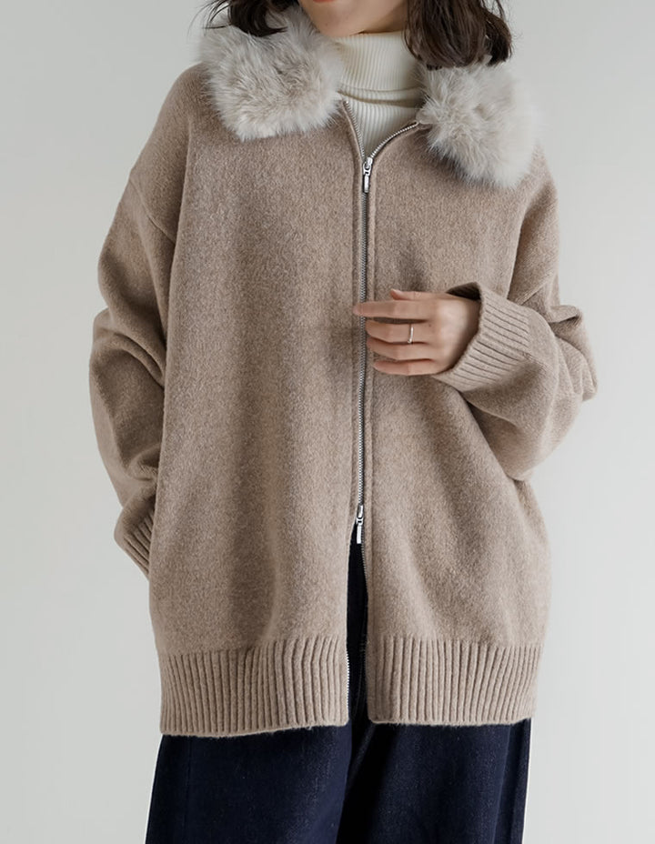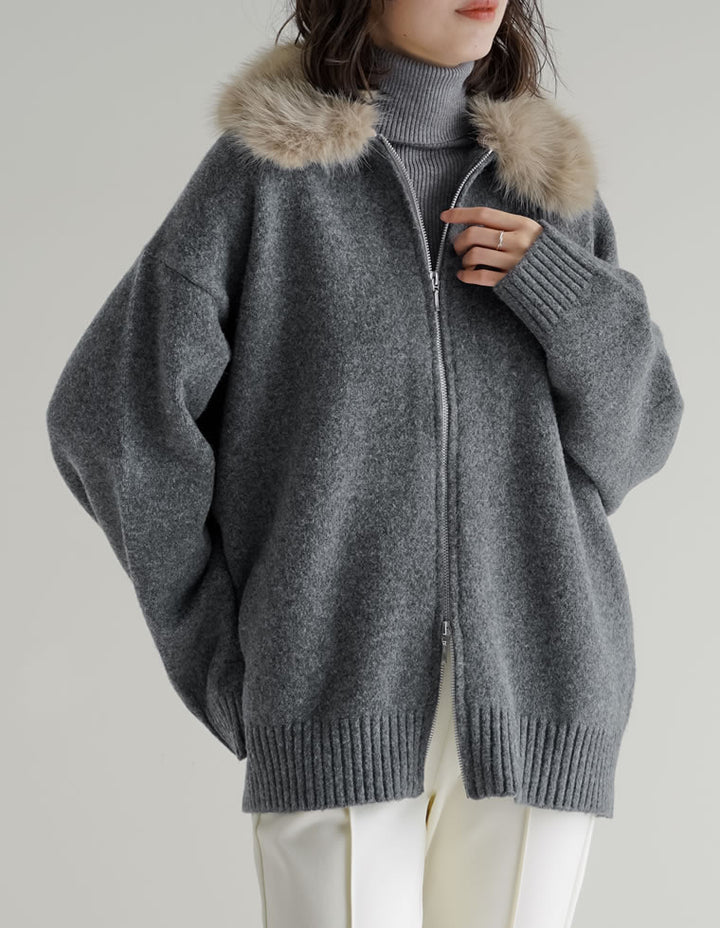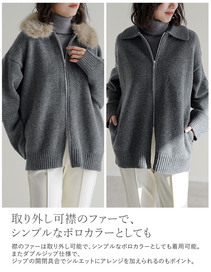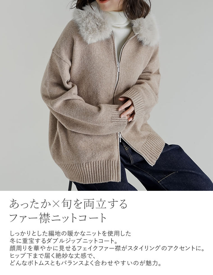 しっかりとした編地の暖かなニットを使用した、冬に重宝するダブルジップニットコート。顔周りを華やかに見せるフェイクファー襟が、スタイリングのアクセントになります。ヒップ下まで届く絶妙な丈感で、どんなボトムスともバランスよく合わせやすいのが魅力。襟はポロカラーデザインを採用しており、カジュアルにもきれいめにも対応できます。ダブルジップ仕様なので、ジップの開閉具合でシルエットにアレンジを加えられるのもポイント。襟のファーは取り外し可能で、シンプルなポロカラーとしても着用可能。冬らしい旬のムードを纏い、コーディネートの主役になるアイテムです。