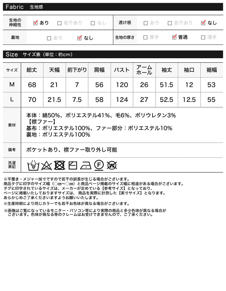 ※洗濯やクリーニングの際、多少色落ちすることがありますので、単品洗い、単品クリーニングしてください。洗剤の量が多いと、色落ちの度合いが高くなりますのでご注意ください。