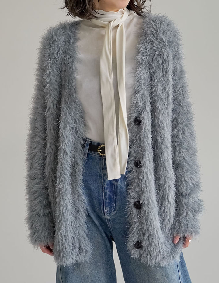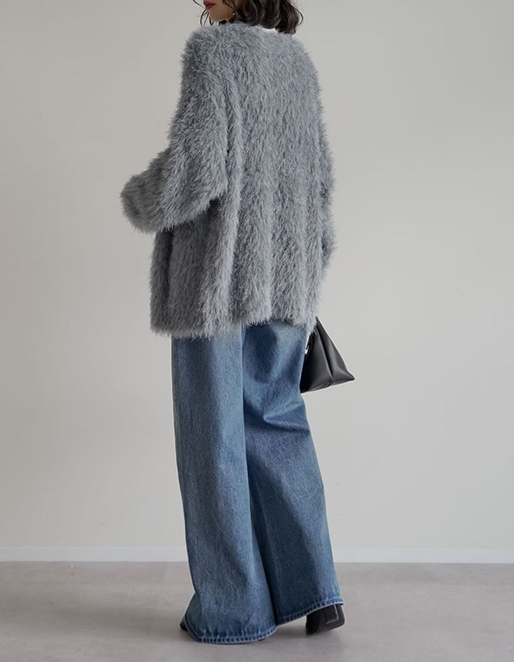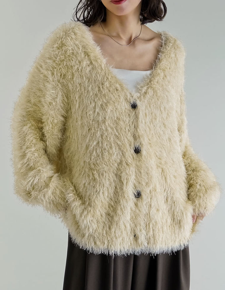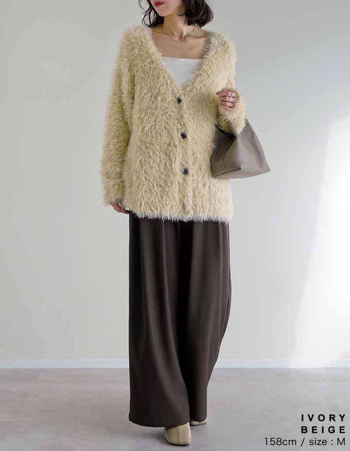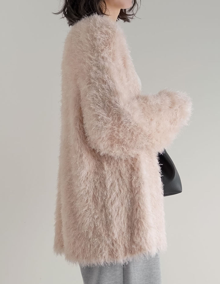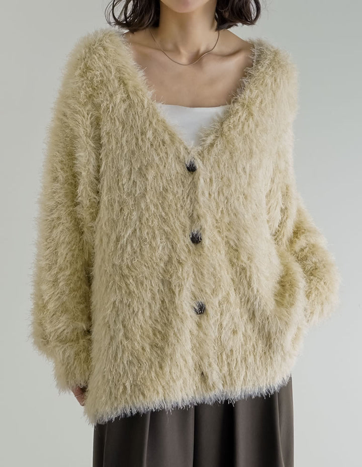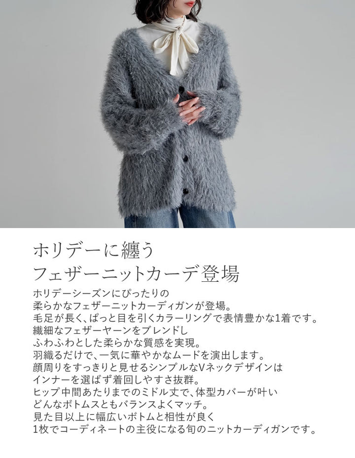 ホリデーシーズンにぴったりの、柔らかなフェザーニットカーディガンが登場。毛足が長く、ぱっと目を引くカラーリングで表情豊かな1着です。繊細なフェザーヤーンをブレンドし、ふわふわとした柔らかな質感を実現。羽織るだけで、一気に華やかなムードを演出します。顔周りをすっきりと見せるシンプルなVネックデザインは、インナーを選ばず着回しやすさ抜群。ヒップ中間あたりまでのミドル丈で、体型カバーが叶い、どんなボトムスともバランスよくマッチ。見た目以上に幅広いボトムと相性が良く、1枚でコーディネートの主役になる旬のニットカーディガンです。