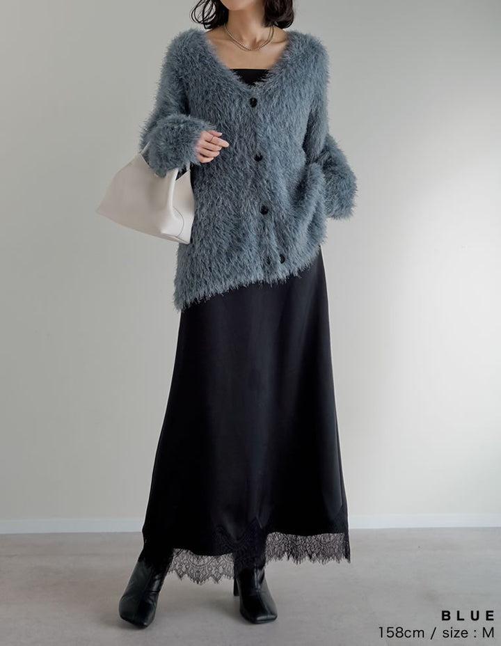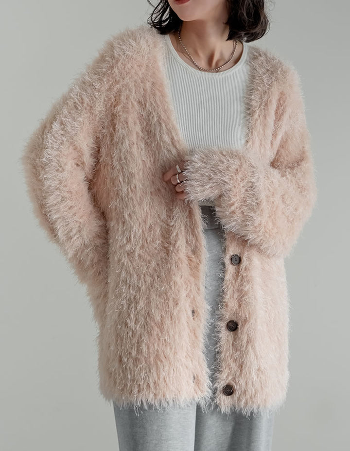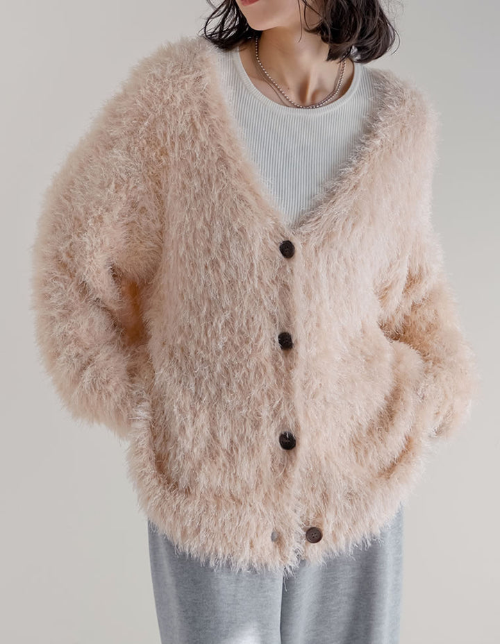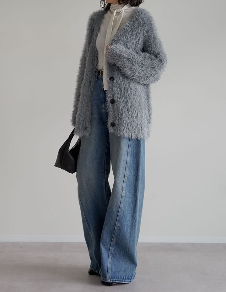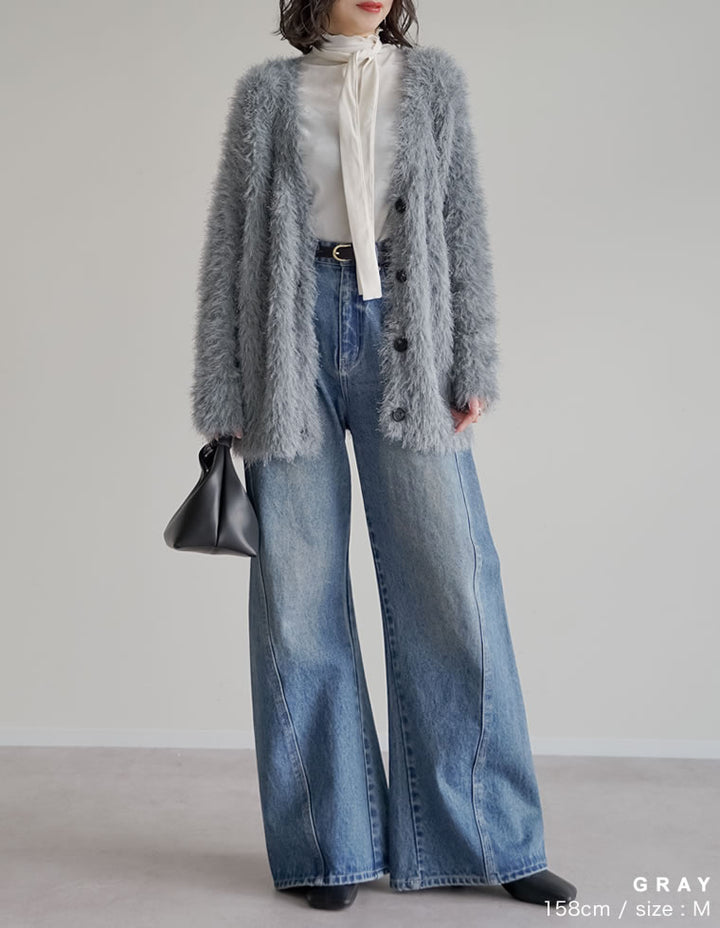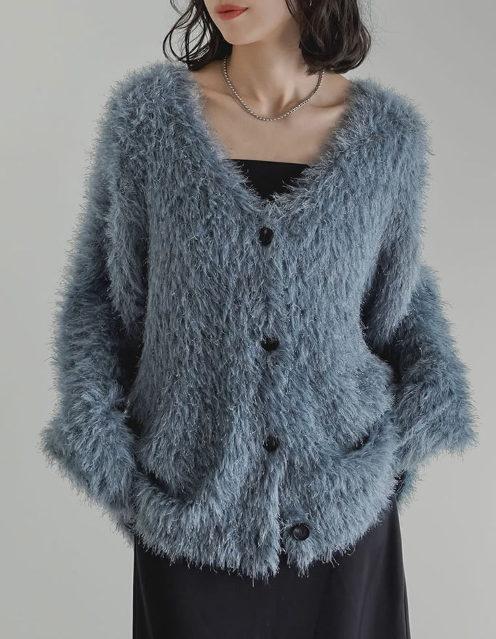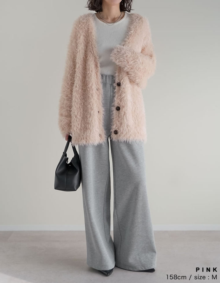 ホリデーシーズンにぴったりの、柔らかなフェザーニットカーディガンが登場。毛足が長く、ぱっと目を引くカラーリングで表情豊かな1着です。繊細なフェザーヤーンをブレンドし、ふわふわとした柔らかな質感を実現。羽織るだけで、一気に華やかなムードを演出します。顔周りをすっきりと見せるシンプルなVネックデザインは、インナーを選ばず着回しやすさ抜群。ヒップ中間あたりまでのミドル丈で、体型カバーが叶い、どんなボトムスともバランスよくマッチ。見た目以上に幅広いボトムと相性が良く、1枚でコーディネートの主役になる旬のニットカーディガンです。