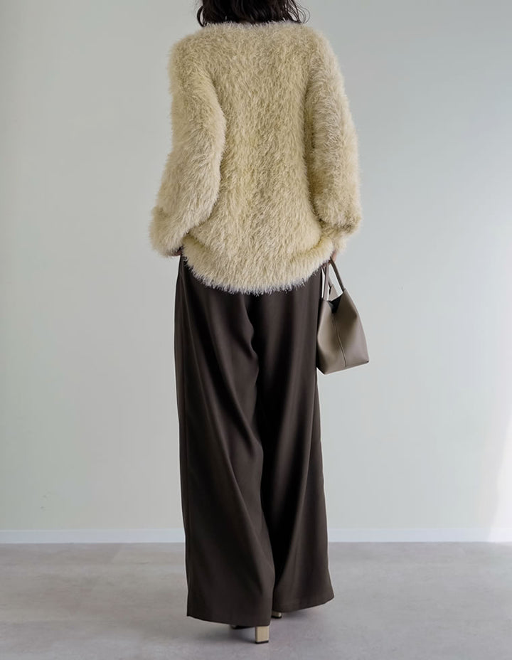 デニムやワイドパンツと合わせれば、ニットの柔らかな質感と相まって、カジュアルながらも女性らしいこなれたスタイルが完成します。