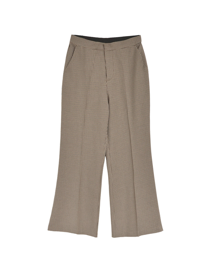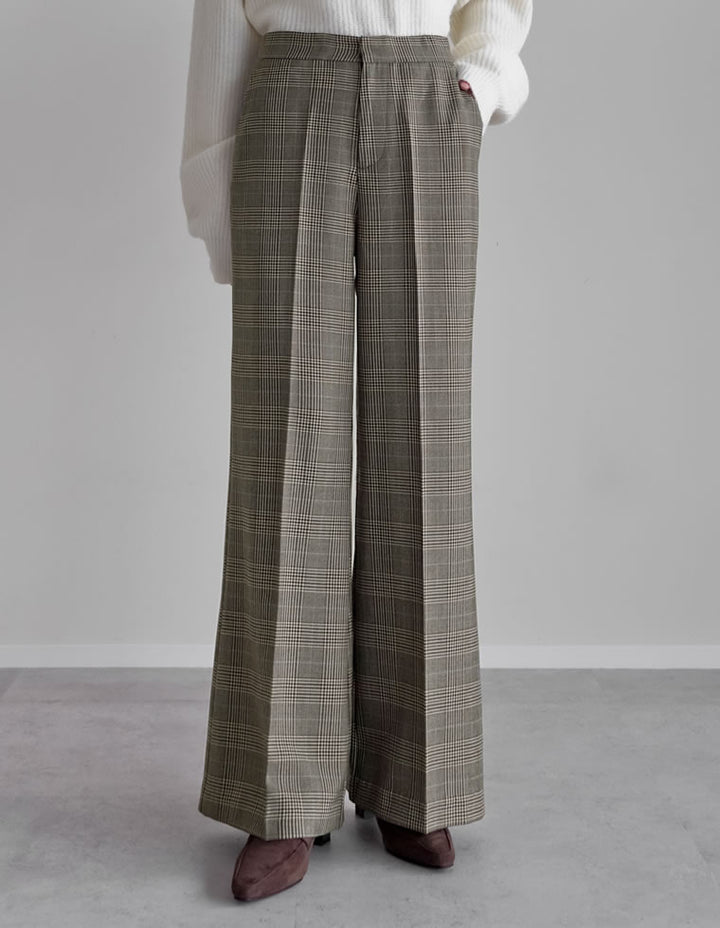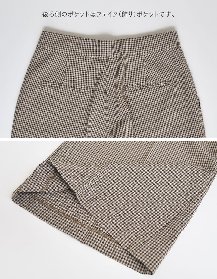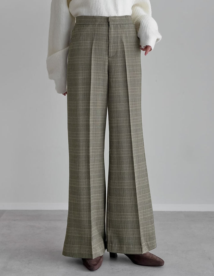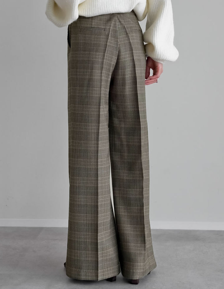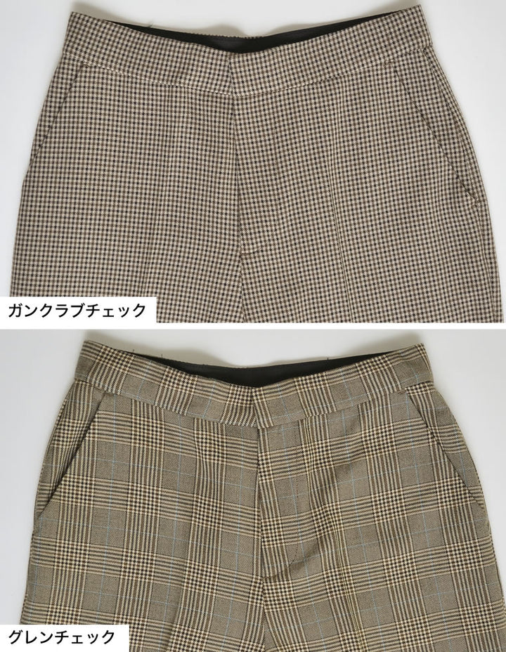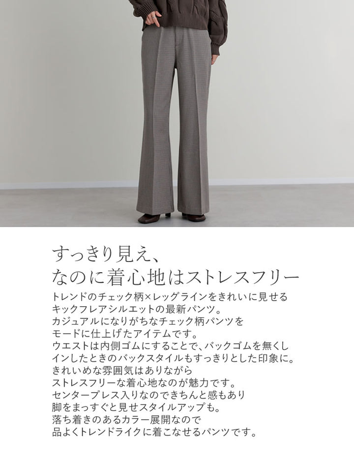 トレンドのチェック柄と、レッグラインを美しく見せるキックフレアシルエットを取り入れた最新パンツ。カジュアルになりがちなチェック柄パンツを、モードな雰囲気に仕上げた1本です。ウエストは内側にゴムを施すことで、外側からはゴムが見えず、インしたときのバックスタイルもすっきり。きれいめなルックスながら、ストレスフリーな着心地を叶えます。センタープレス入りで脚の縦ラインを強調し、まっすぐ美しいシルエットを演出。落ち着きのあるカラー展開で、品よくトレンド感を取り入れられるパンツです。