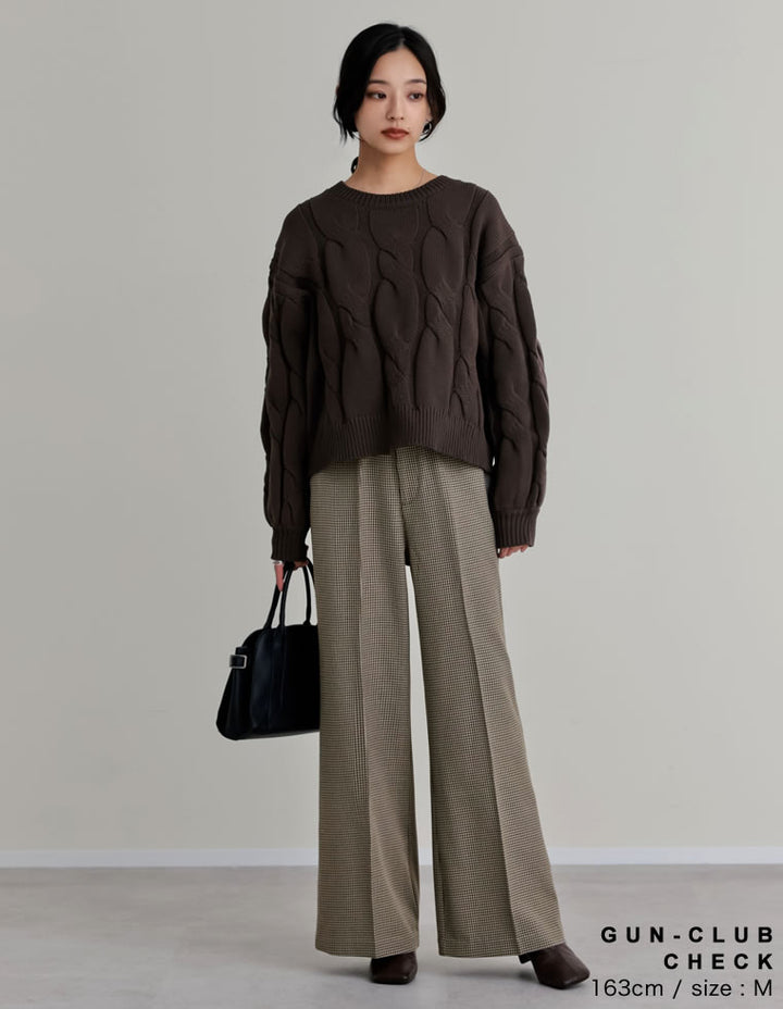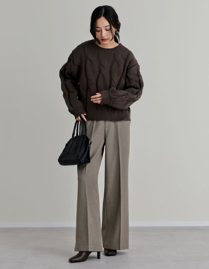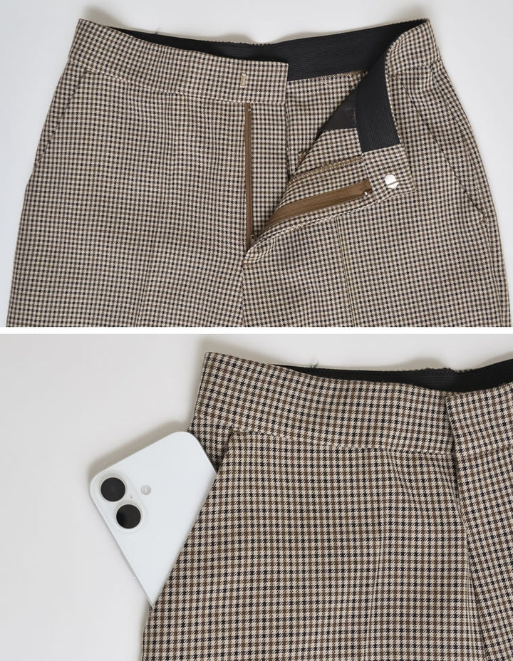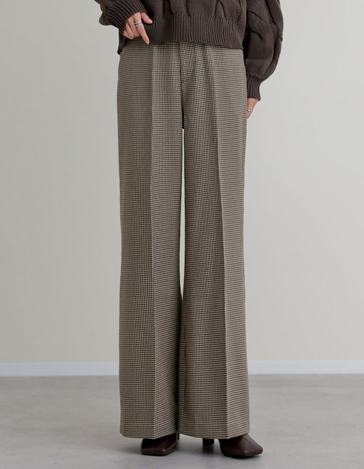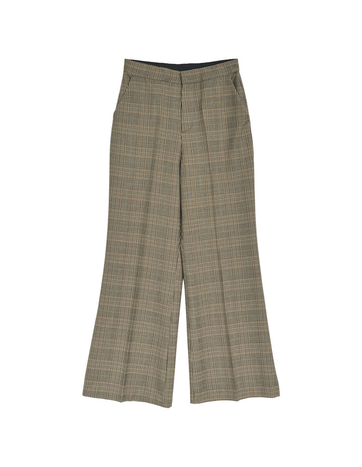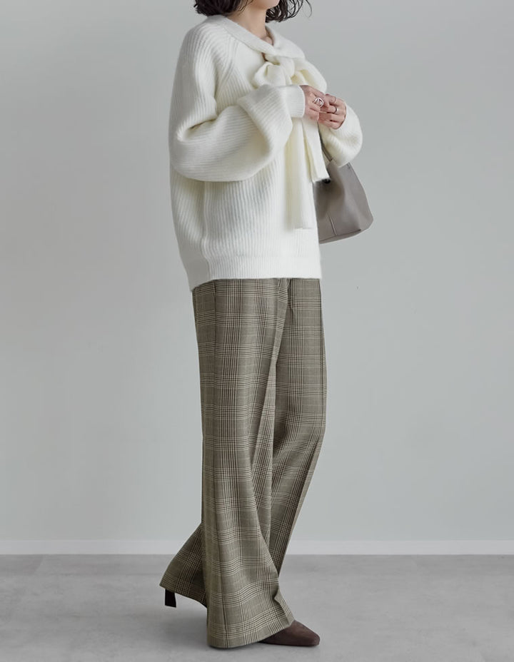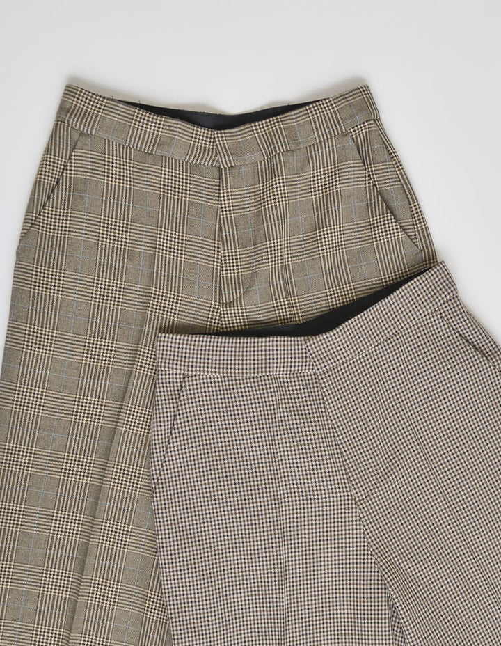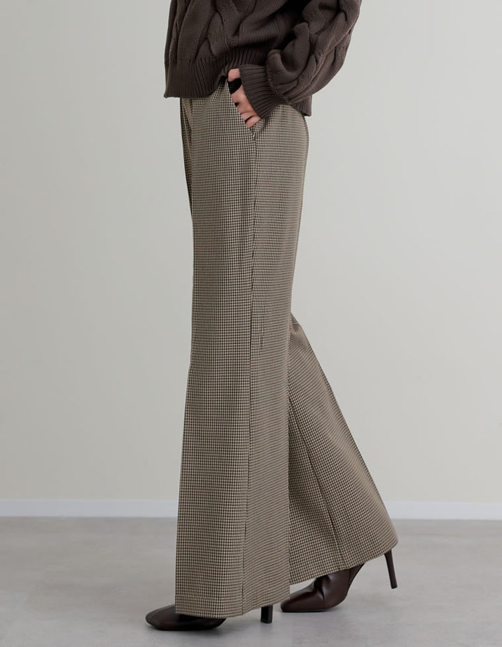 トレンドのチェック柄と、レッグラインを美しく見せるキックフレアシルエットを取り入れた最新パンツ。カジュアルになりがちなチェック柄パンツを、モードな雰囲気に仕上げた1本です。ウエストは内側にゴムを施すことで、外側からはゴムが見えず、インしたときのバックスタイルもすっきり。きれいめなルックスながら、ストレスフリーな着心地を叶えます。センタープレス入りで脚の縦ラインを強調し、まっすぐ美しいシルエットを演出。落ち着きのあるカラー展開で、品よくトレンド感を取り入れられるパンツです。