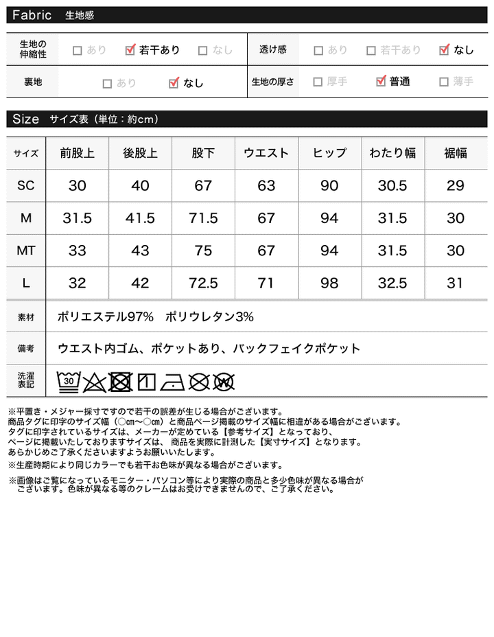 | サイズ | 前股上 | 後股上 | 股下 | ウエスト | ヒップ | わたり幅 | 裾幅 |