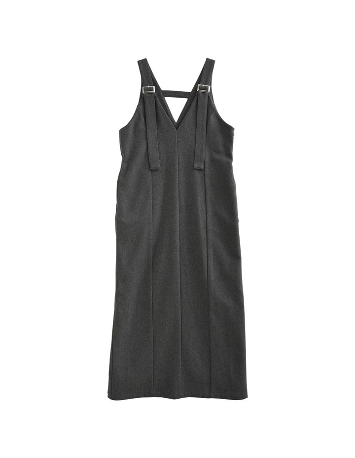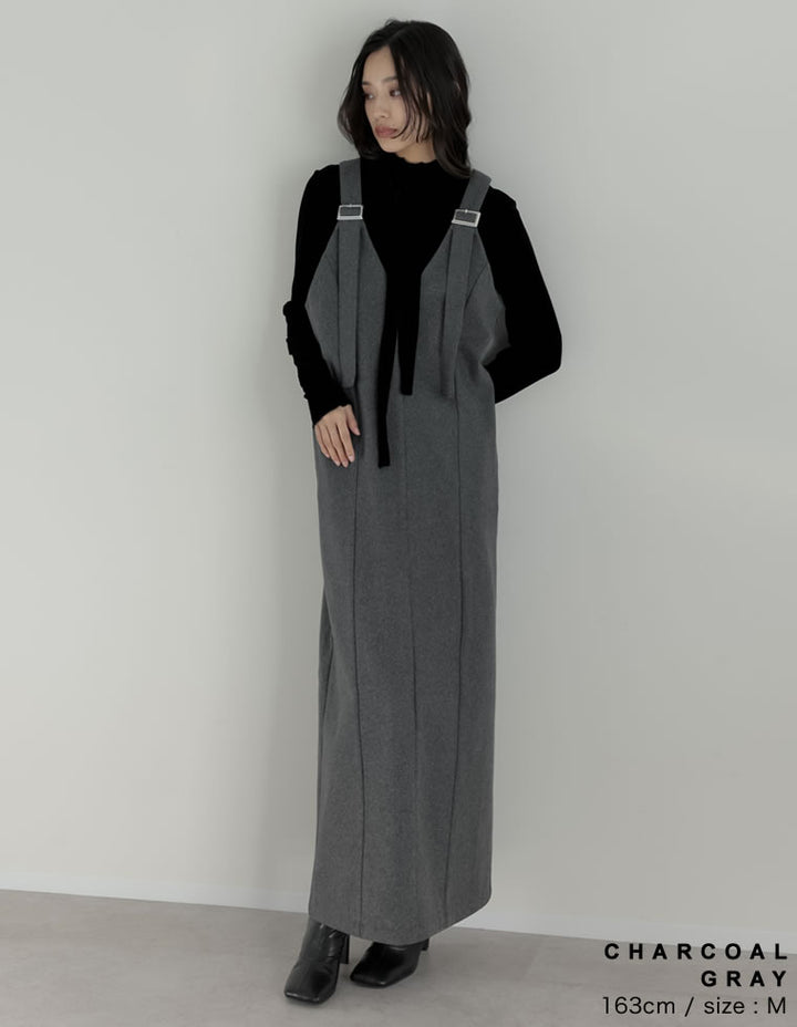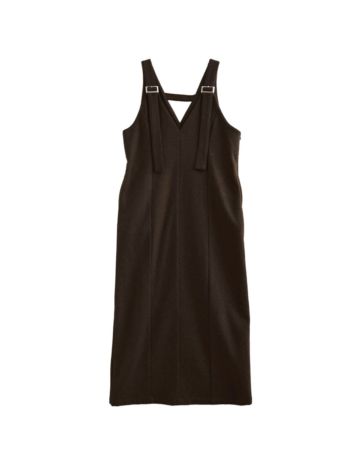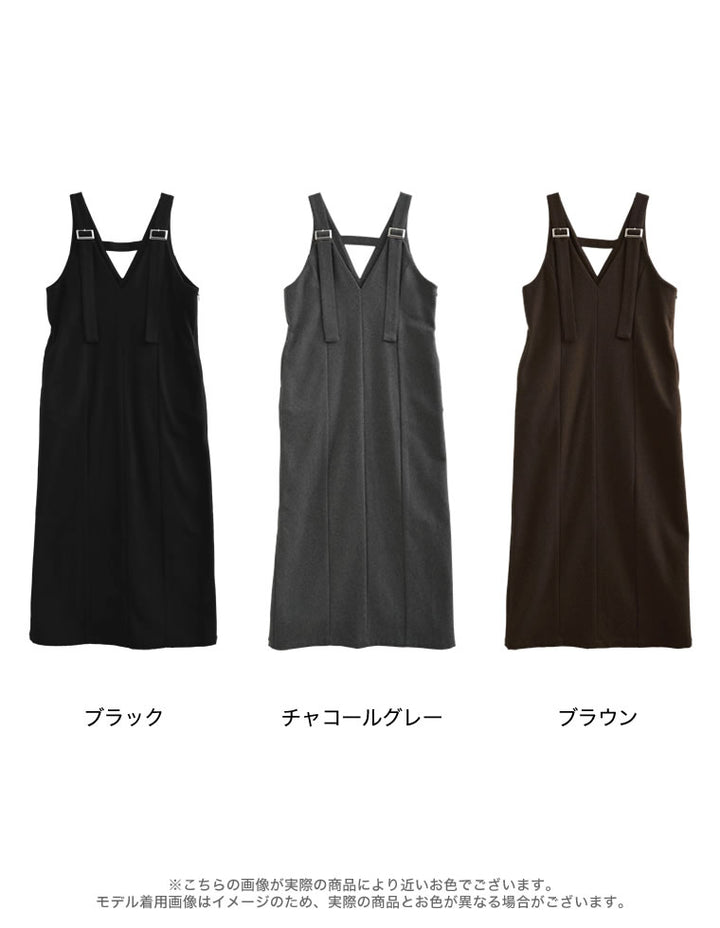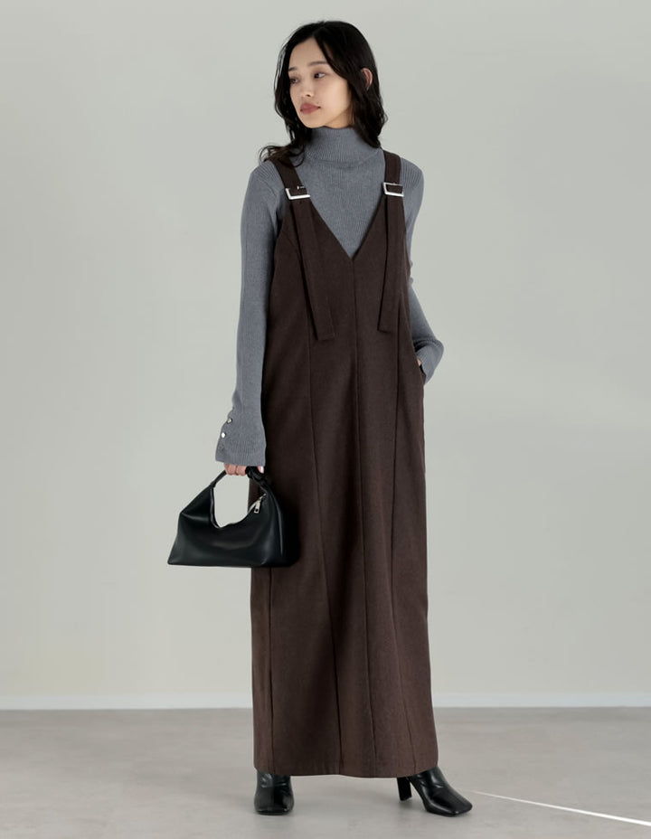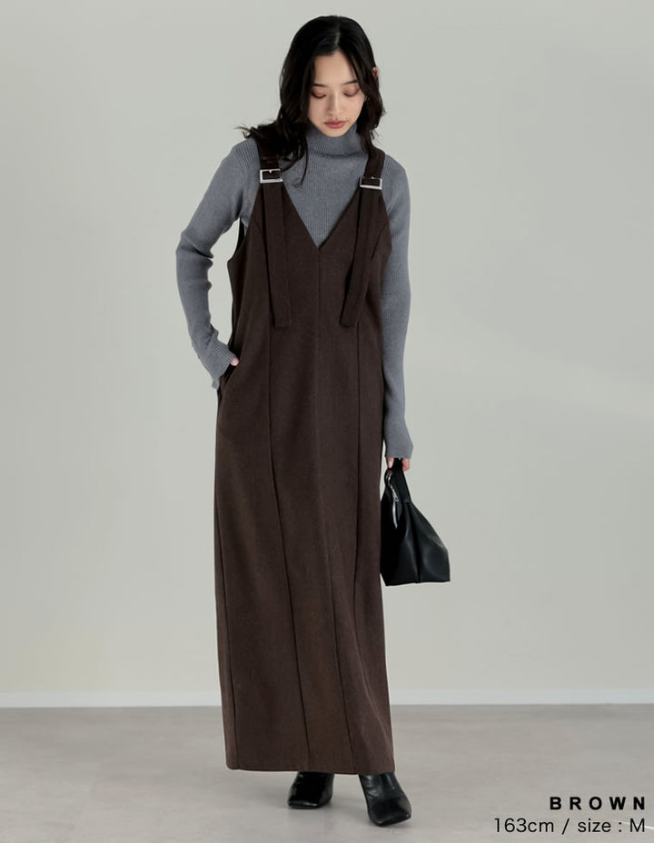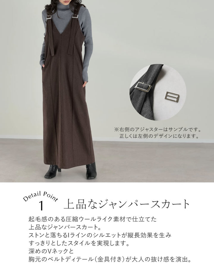起毛感のある圧縮ウールライク素材で仕立てた、きれいめに着こなせるジャンパースカート。すとんと落ちるIラインシルエットが縦長効果を生み、すっきりとしたスタイルを実現します。深めのVネックと胸元のベルトディテールが、大人の抜け感をプラス。リブニットをインしてきれいめに、カットソーを合わせてカジュアルダウンするなど、トレンドのレイヤードスタイルを楽しめるのもポイントです。暖かな圧縮ウールライク素材で、秋冬のコーディネートに活躍する1着です。