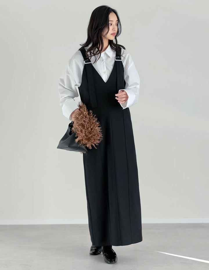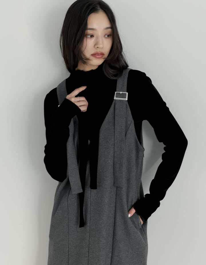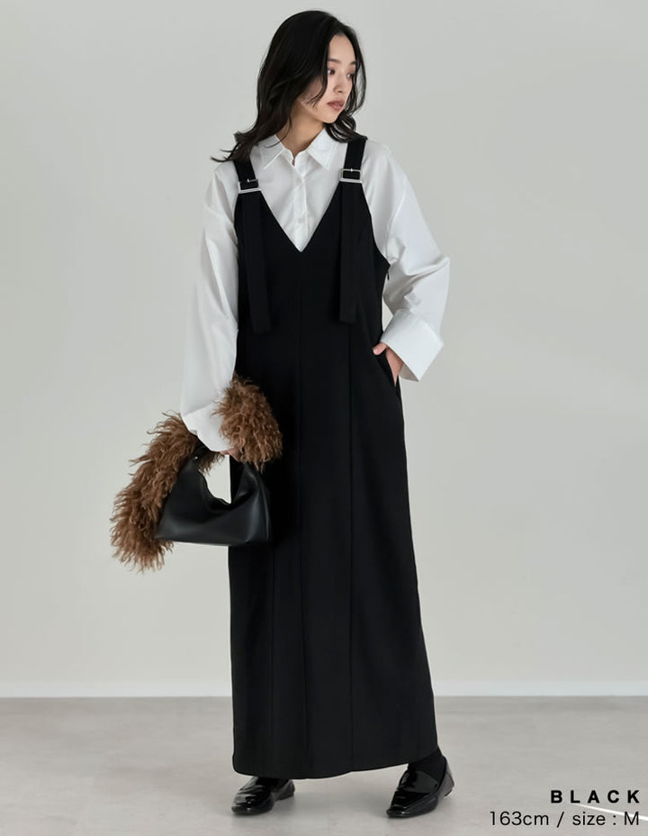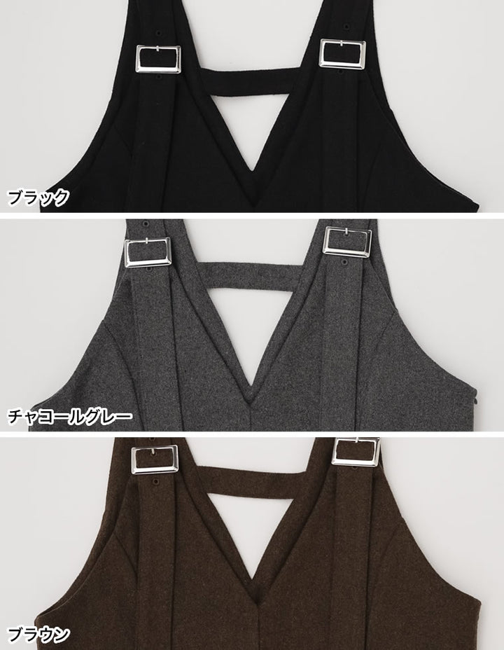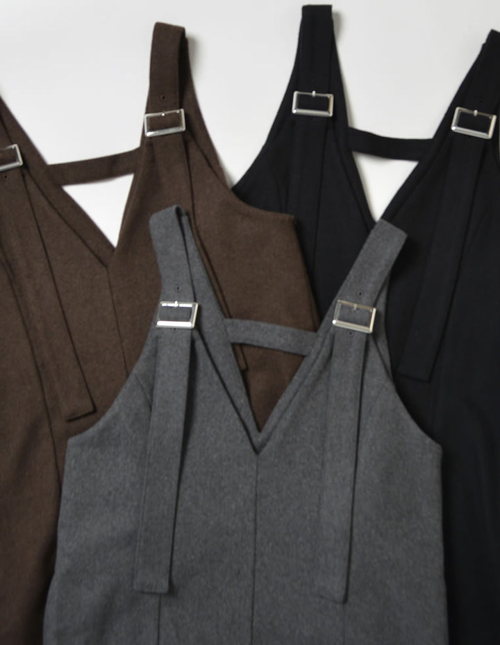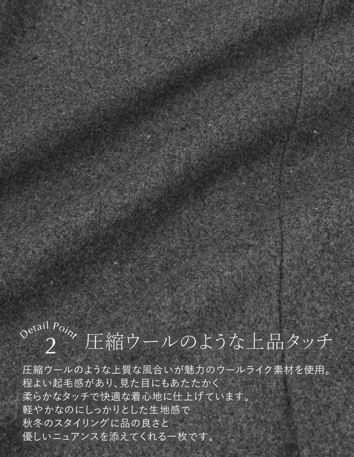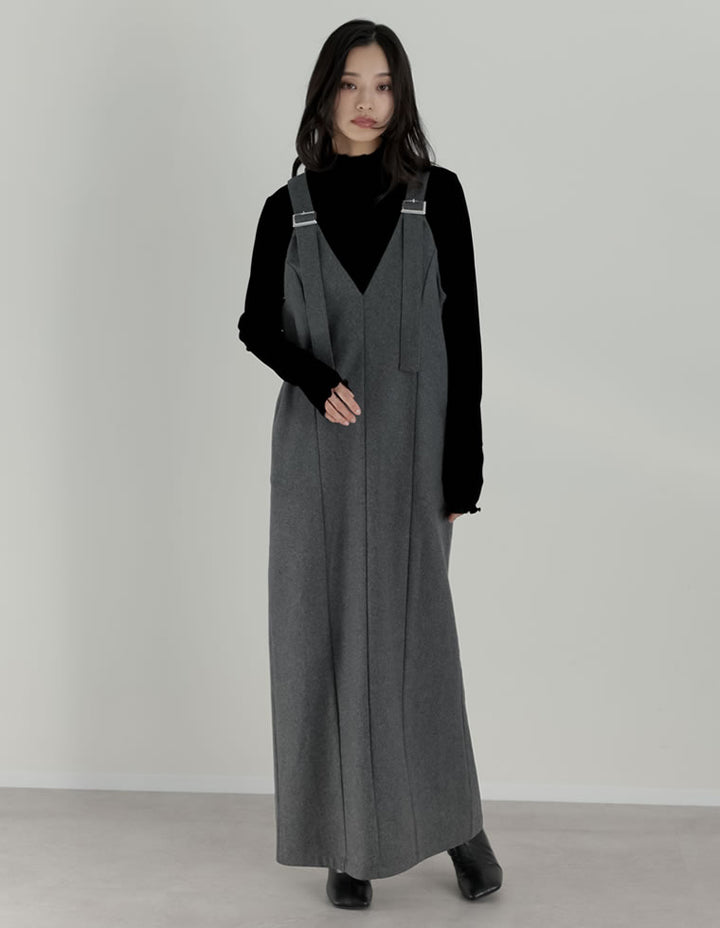 起毛感のある圧縮ウールライク素材で仕立てた、きれいめに着こなせるジャンパースカート。すとんと落ちるIラインシルエットが縦長効果を生み、すっきりとしたスタイルを実現します。深めのVネックと胸元のベルトディテールが、大人の抜け感をプラス。リブニットをインしてきれいめに、カットソーを合わせてカジュアルダウンするなど、トレンドのレイヤードスタイルを楽しめるのもポイントです。暖かな圧縮ウールライク素材で、秋冬のコーディネートに活躍する1着です。