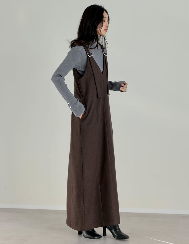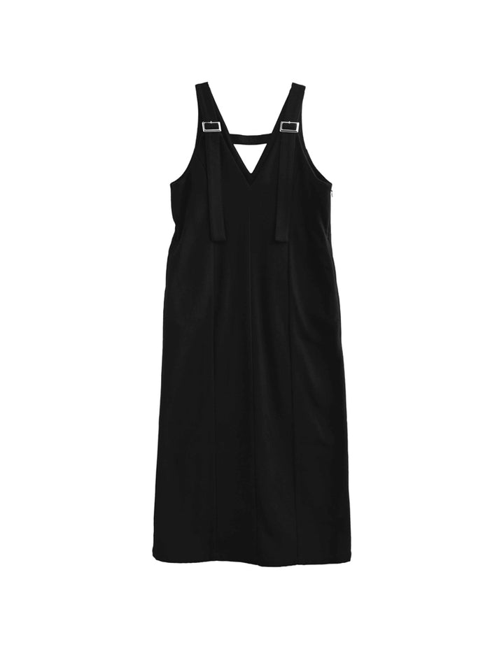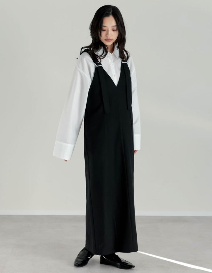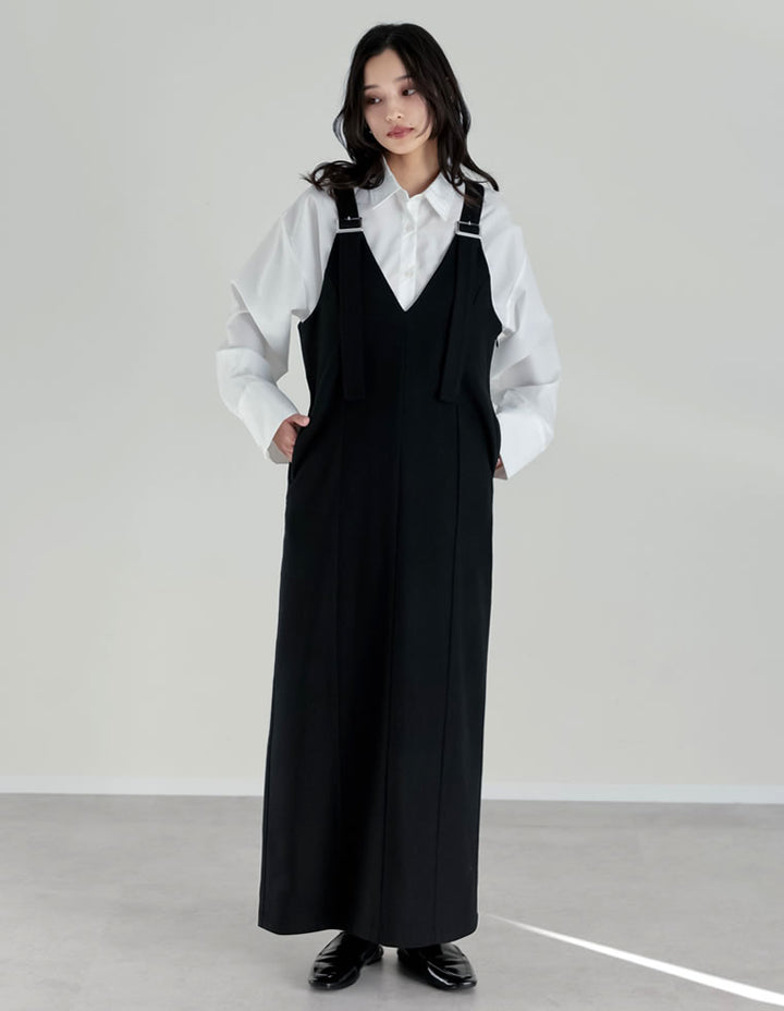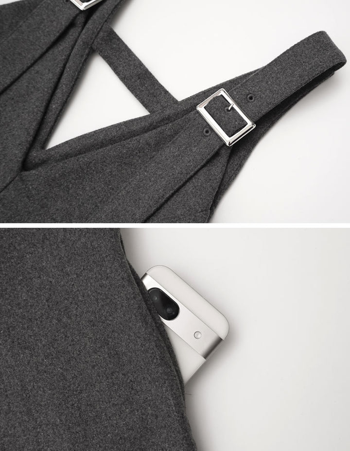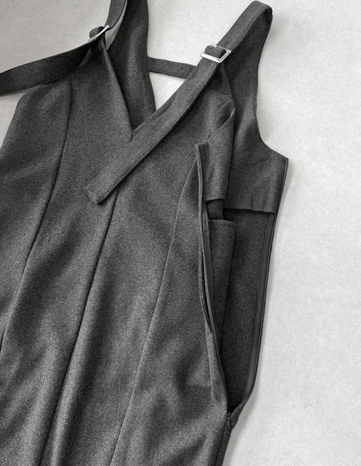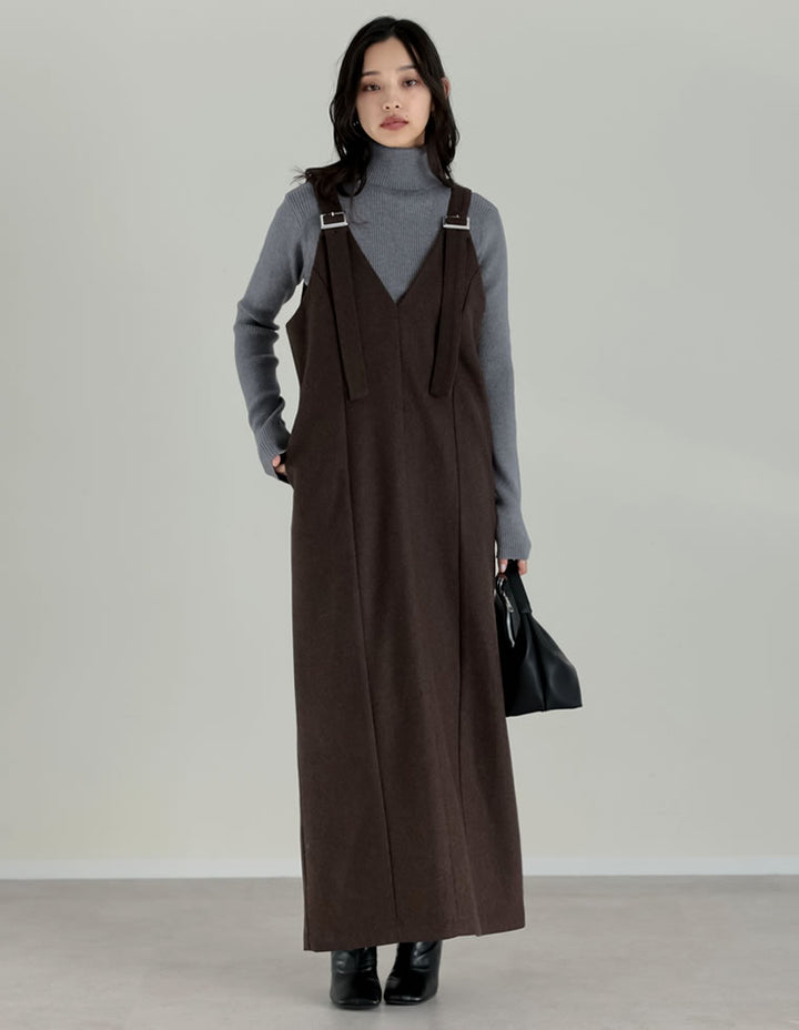 起毛感のある圧縮ウールライク素材で仕立てた、きれいめに着こなせるジャンパースカート。すとんと落ちるIラインシルエットが縦長効果を生み、すっきりとしたスタイルを実現します。深めのVネックと胸元のベルトディテールが、大人の抜け感をプラス。リブニットをインしてきれいめに、カットソーを合わせてカジュアルダウンするなど、トレンドのレイヤードスタイルを楽しめるのもポイントです。暖かな圧縮ウールライク素材で、秋冬のコーディネートに活躍する1着です。