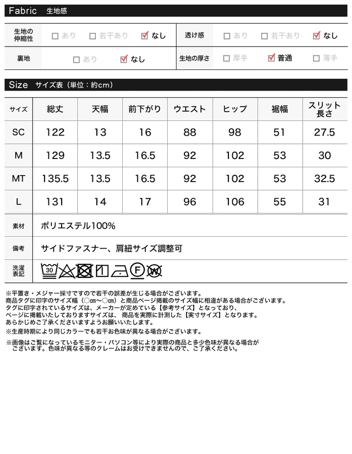 | サイズ | 総丈 | 天幅 | 前下がり | ウエスト | ヒップ | 裾幅 | スリット長さ |