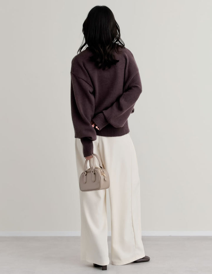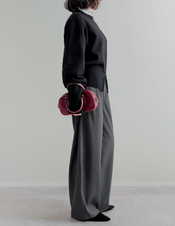 ニットのジップを開けて、ベルトなどのウエストマークのあるパンツを合わせた着こなしがおすすめです。