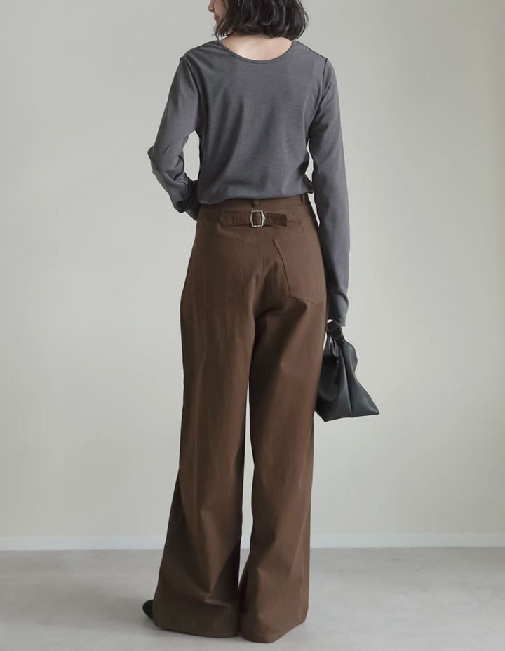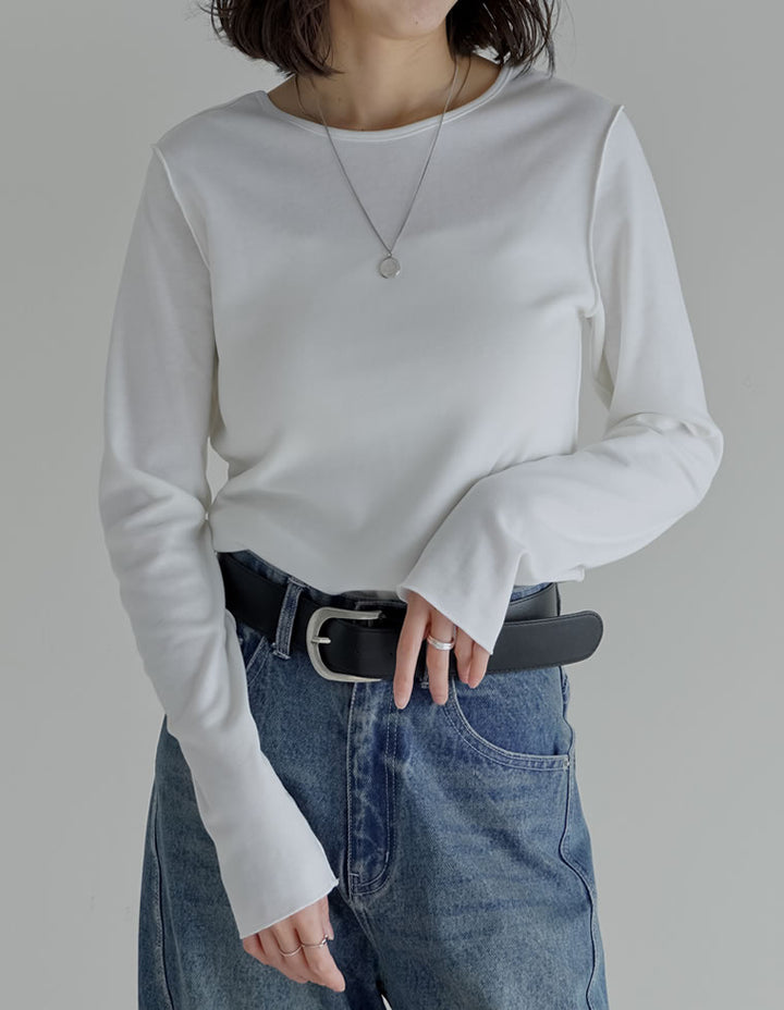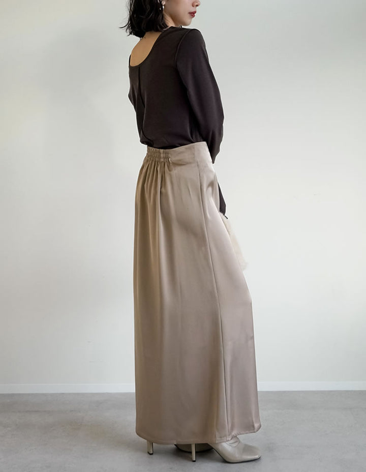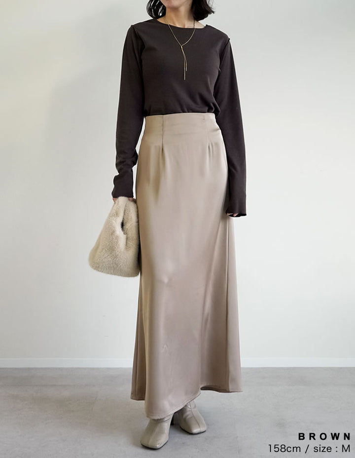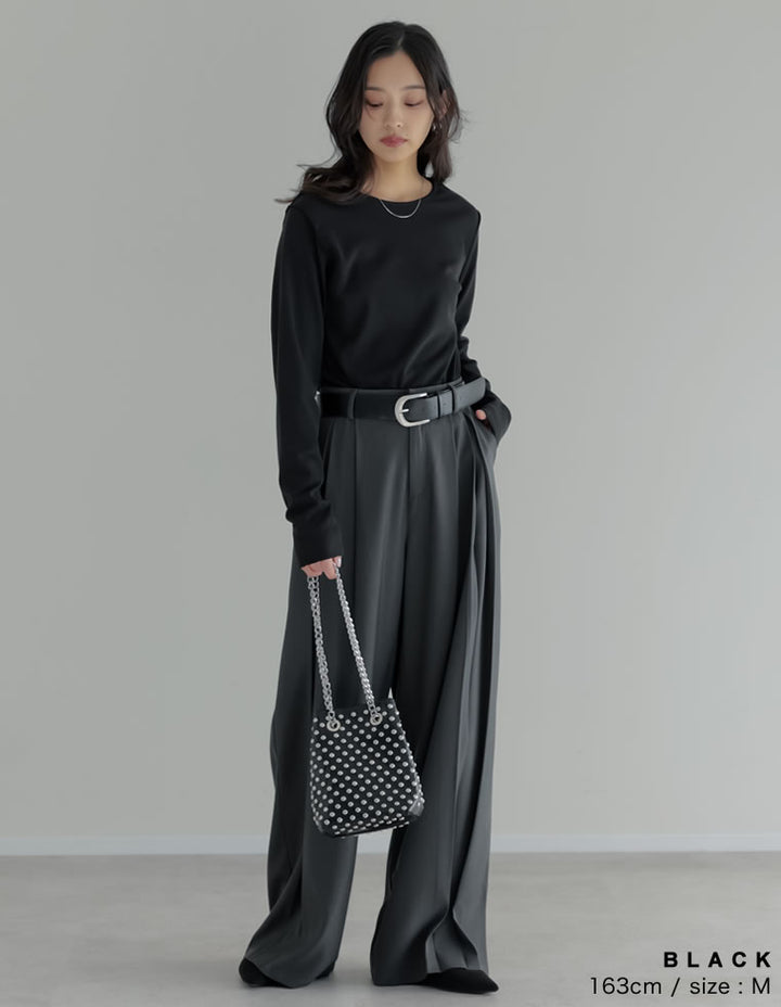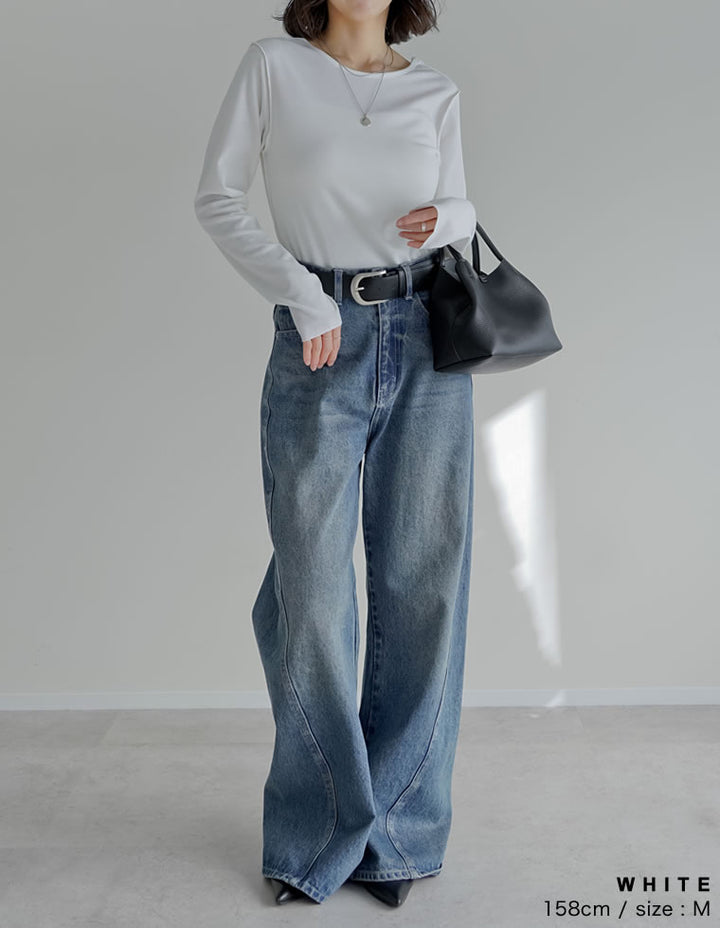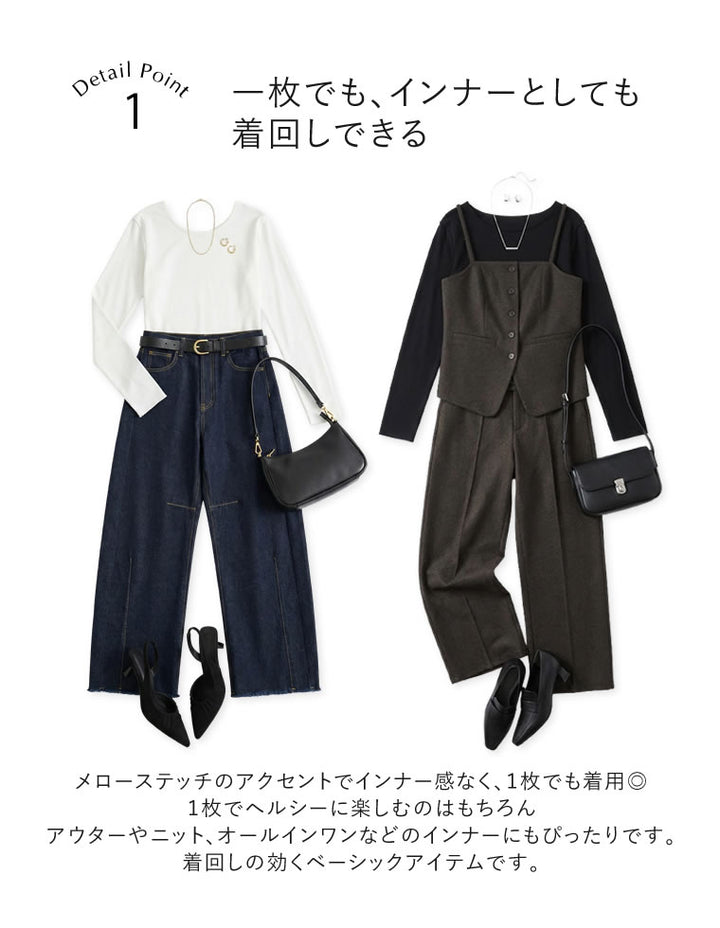 シンプルなデニムやスラックス、ナロースカートなど、どんなボトムとも好相性。メロー始末になっているため、トップスイン・アウトどちらでもバランスよく着用いただけます。アウターや深Vネックニット、オールインワンなどのインナーにもぴったりです。