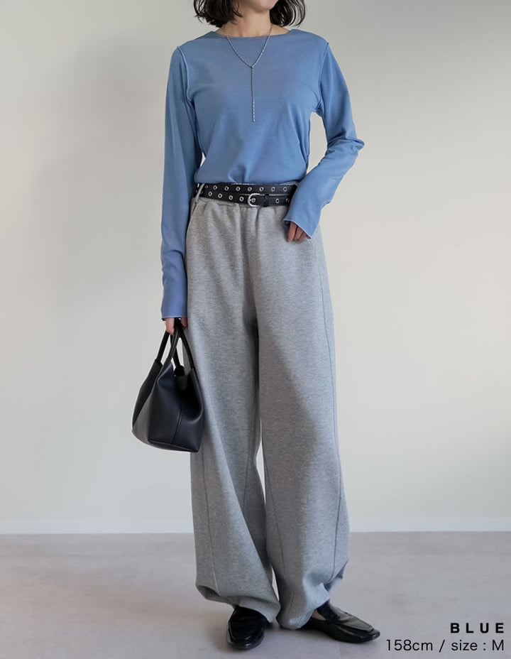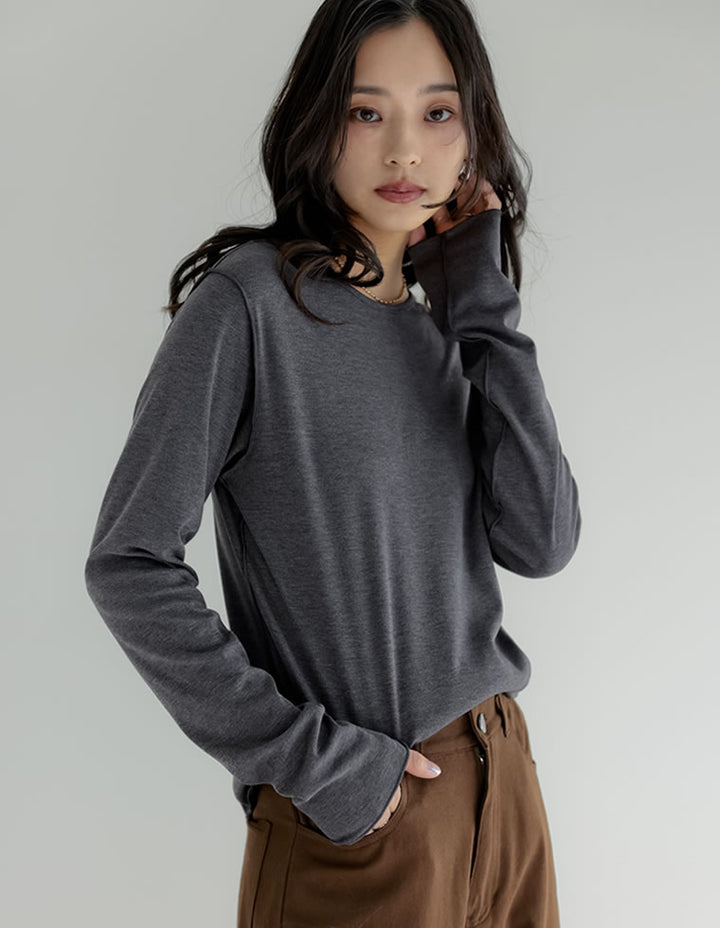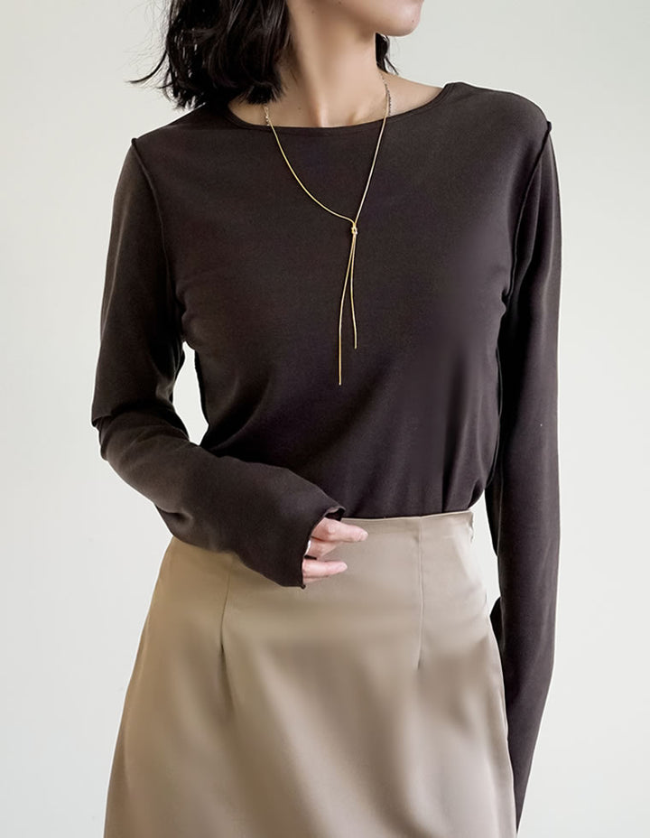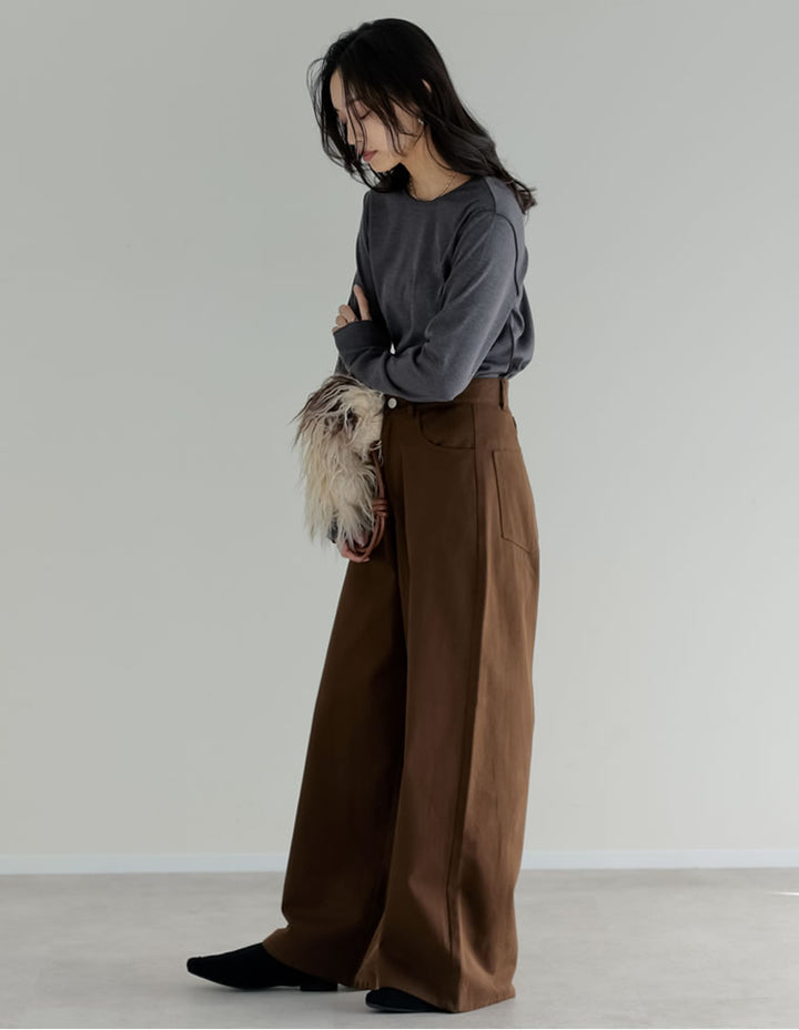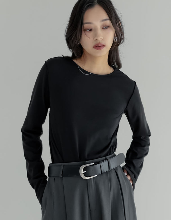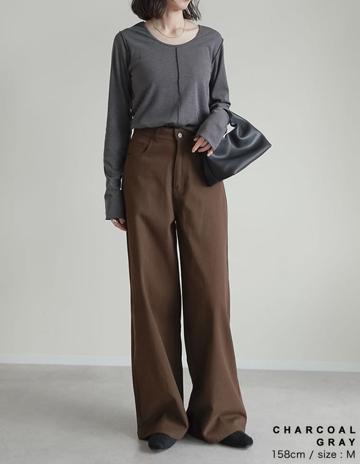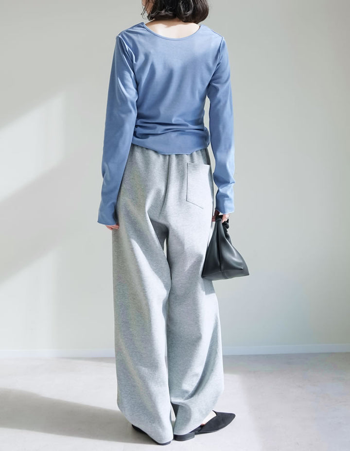 シンプルなデニムやスラックス、ナロースカートなど、どんなボトムとも好相性。メロー始末になっているため、トップスイン・アウトどちらでもバランスよく着用いただけます。アウターや深Vネックニット、オールインワンなどのインナーにもぴったりです。