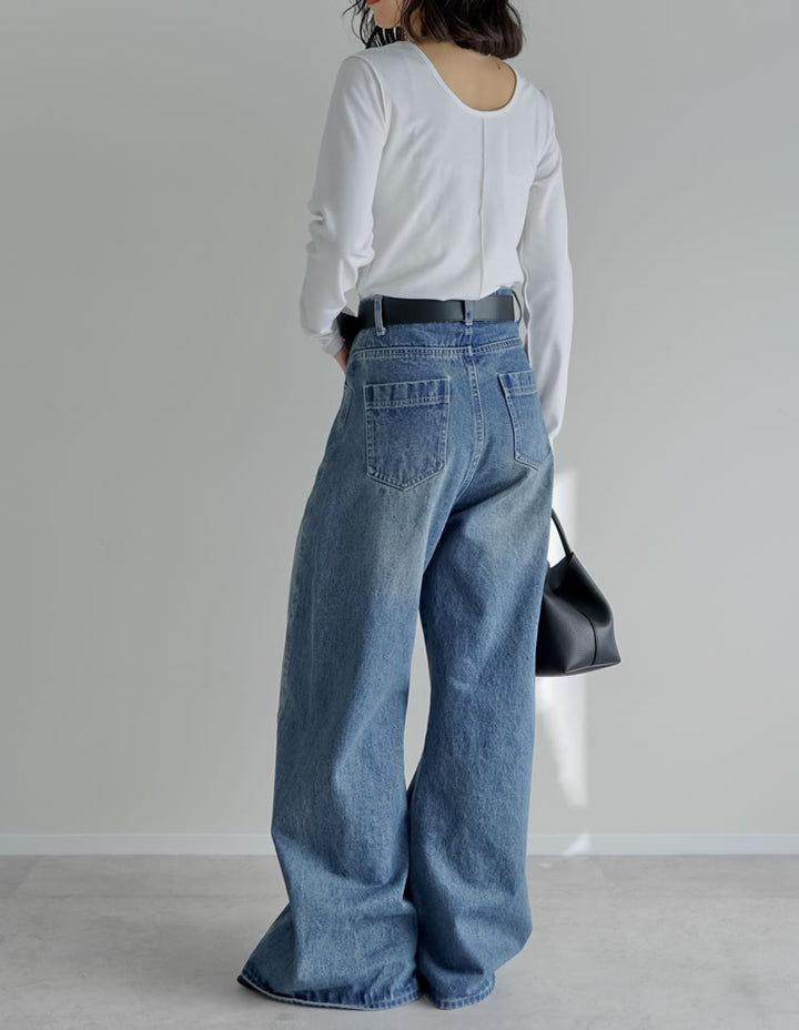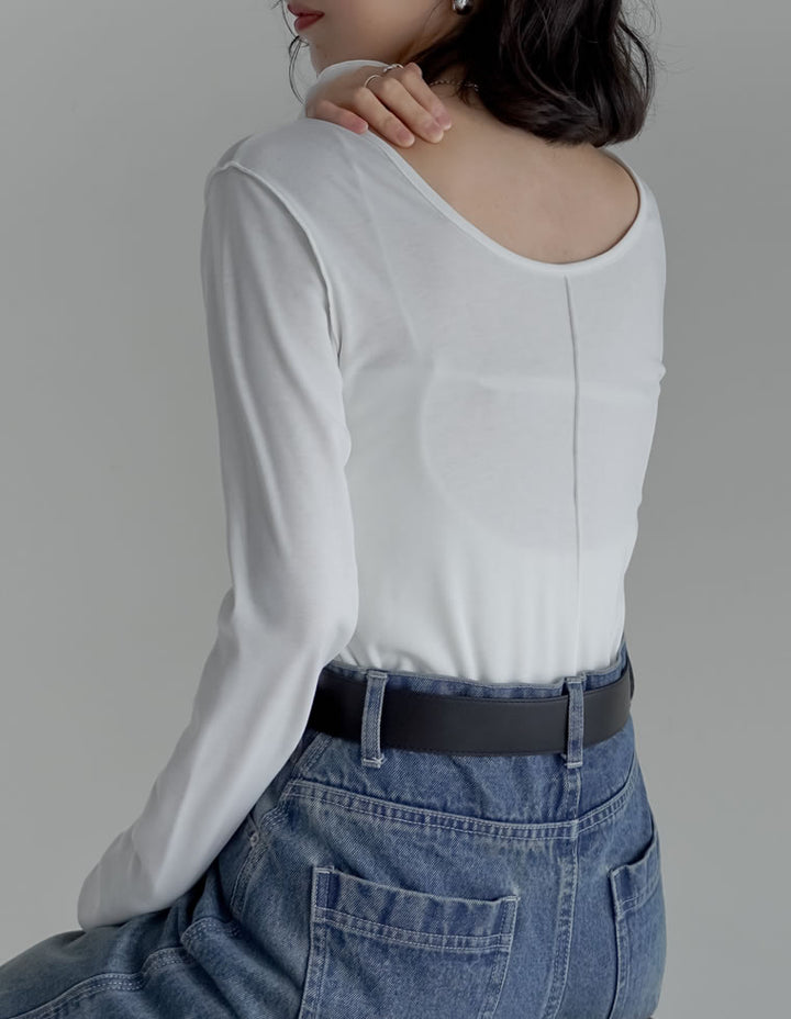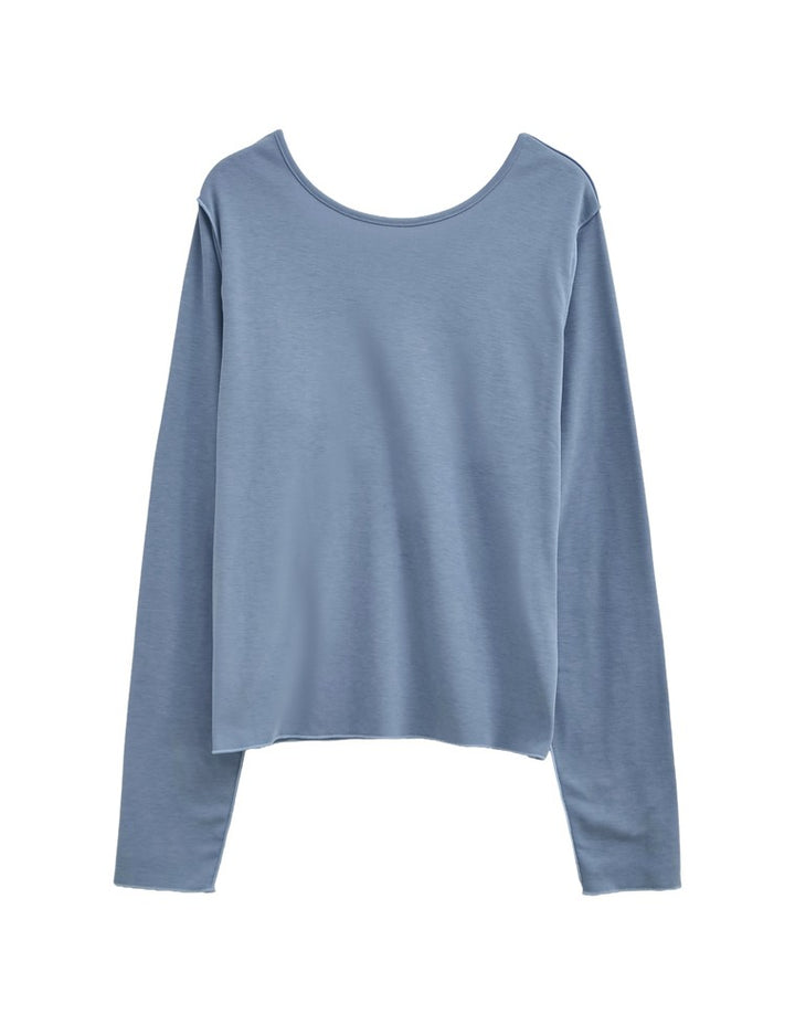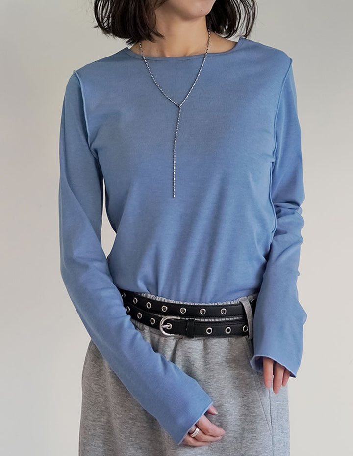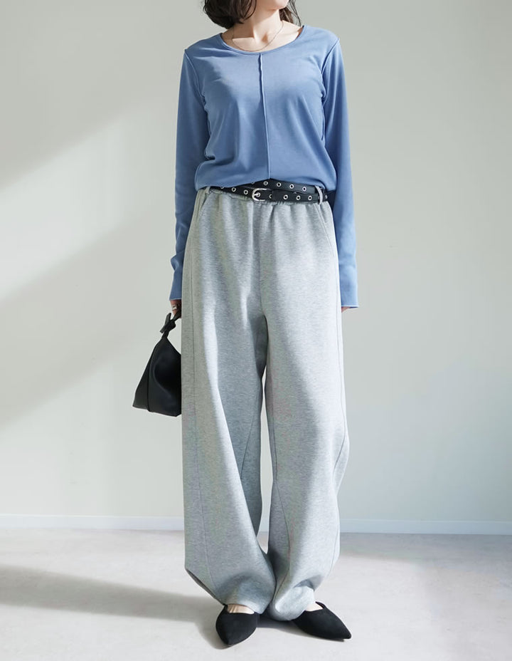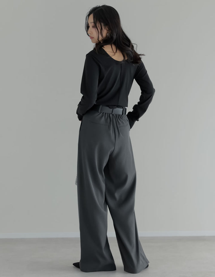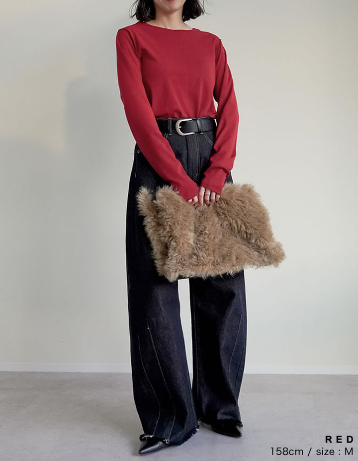シンプルなデニムやスラックス、ナロースカートなど、どんなボトムとも好相性。メロー始末になっているため、トップスイン・アウトどちらでもバランスよく着用いただけます。アウターや深Vネックニット、オールインワンなどのインナーにもぴったりです。