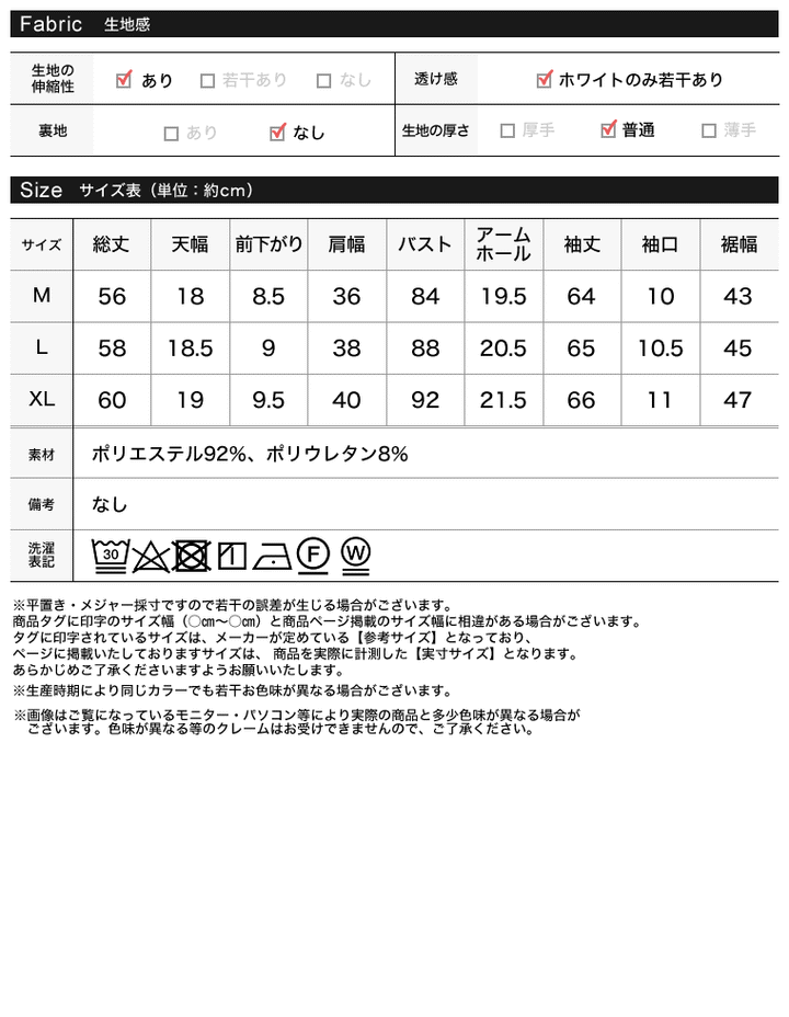 | サイズ | 総丈 | 天幅 | 前下がり | 肩幅 | バスト | アームホール | 袖丈 | 袖口 | 裾幅 |
